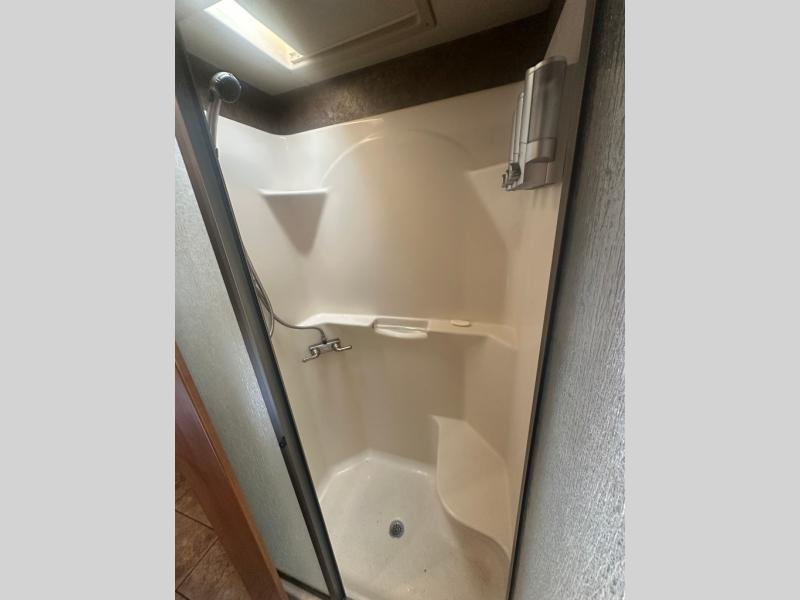 A sliding door blocks off the bedroom and bathroom space from the front living area. When you enter you will find a shower on your right and private toilet and vanity with sink on your left including some overhead storage cabinets.