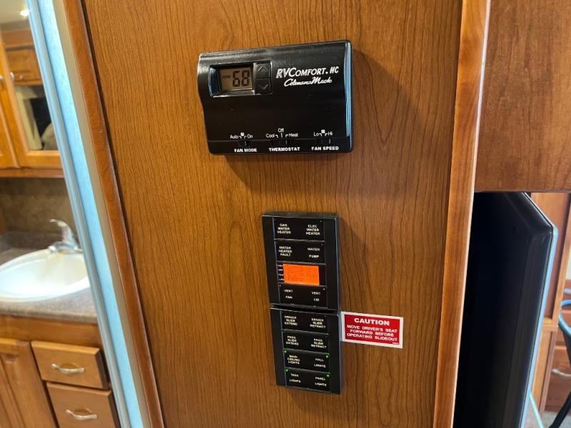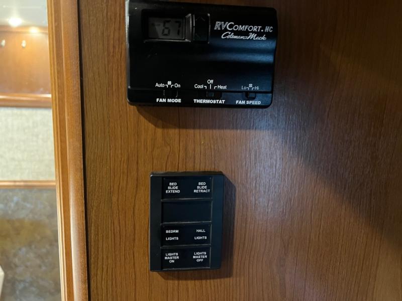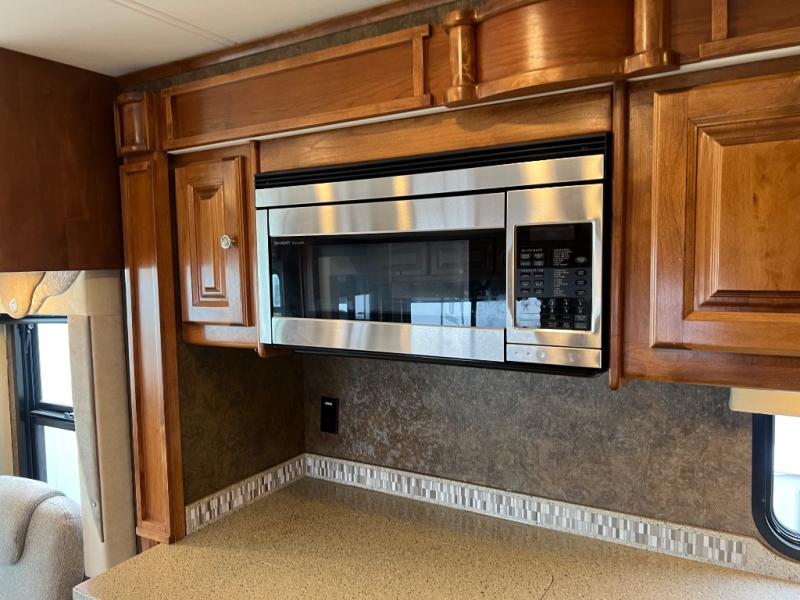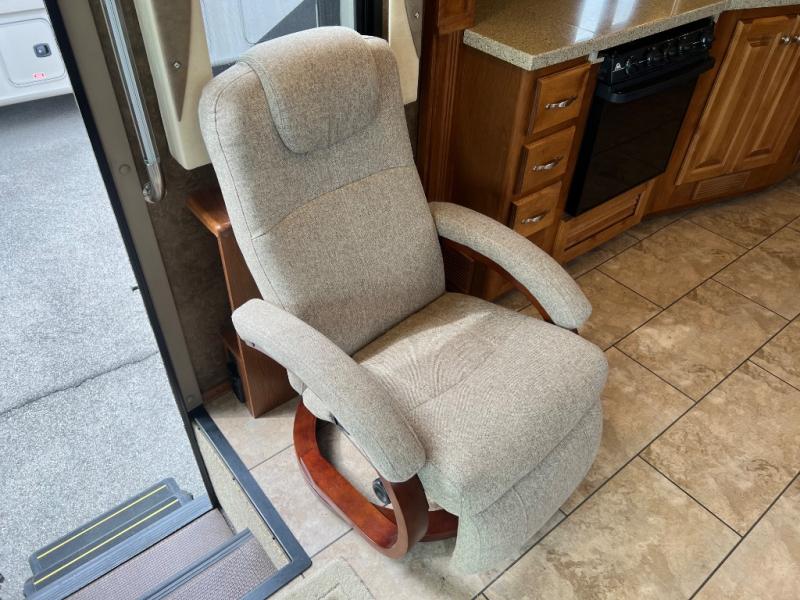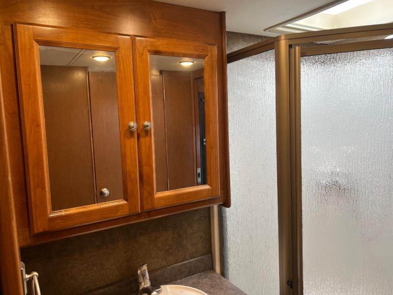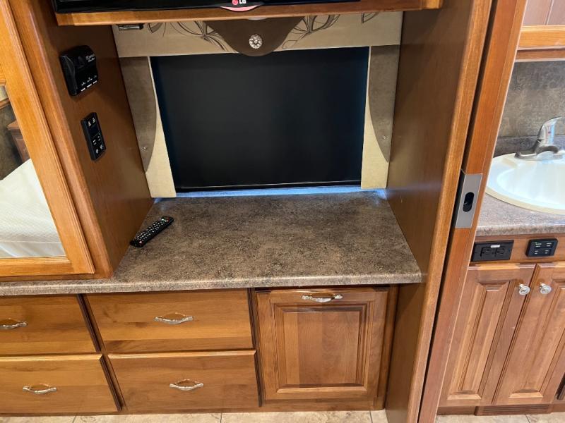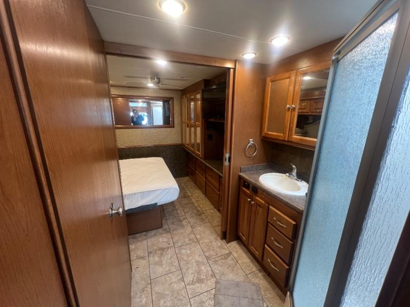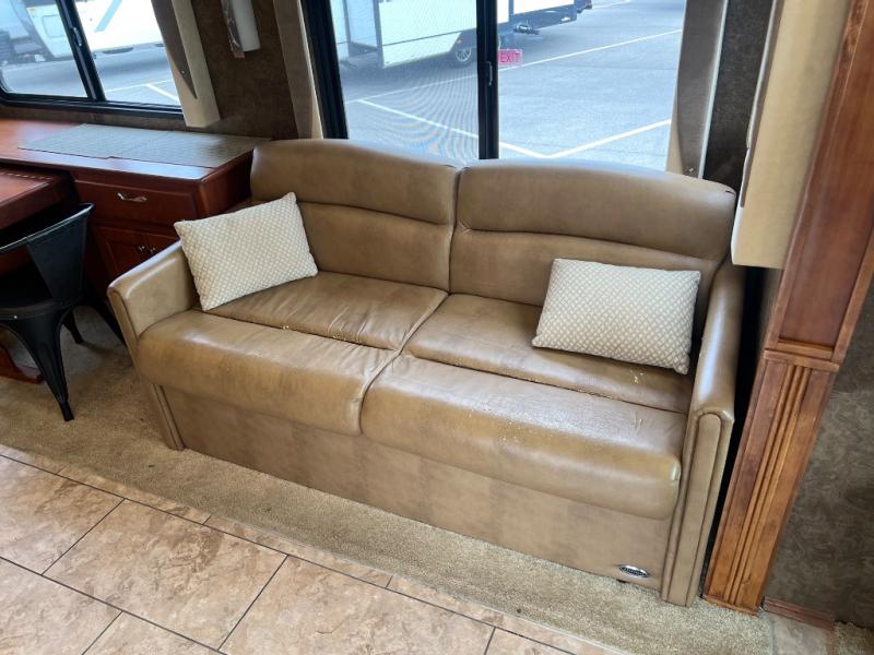A large slide out on the driver's side has a sofa bed, a booth dinette and overhead cabinets. A standard TV with a pantry below is on an inside wall and the TV faces the front of the coach. In place of the booth dinette, you may choose a dinette with computer workstation.