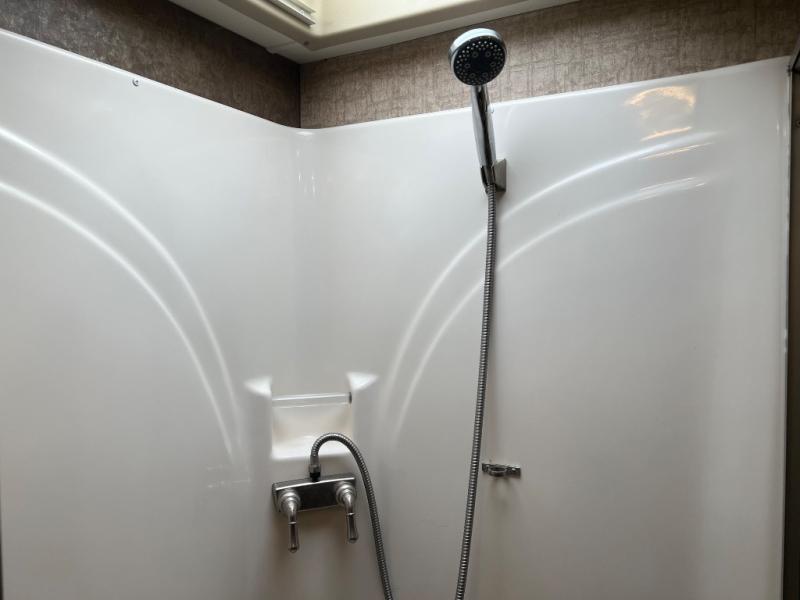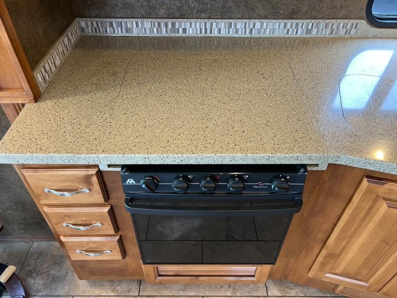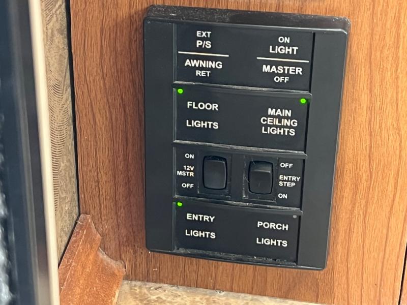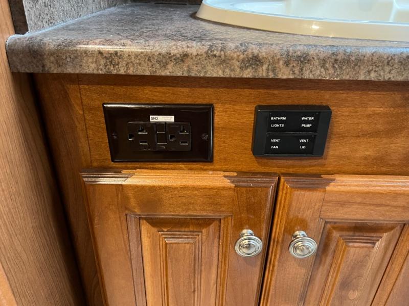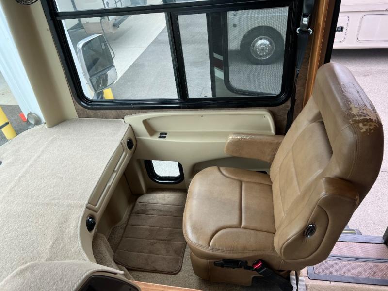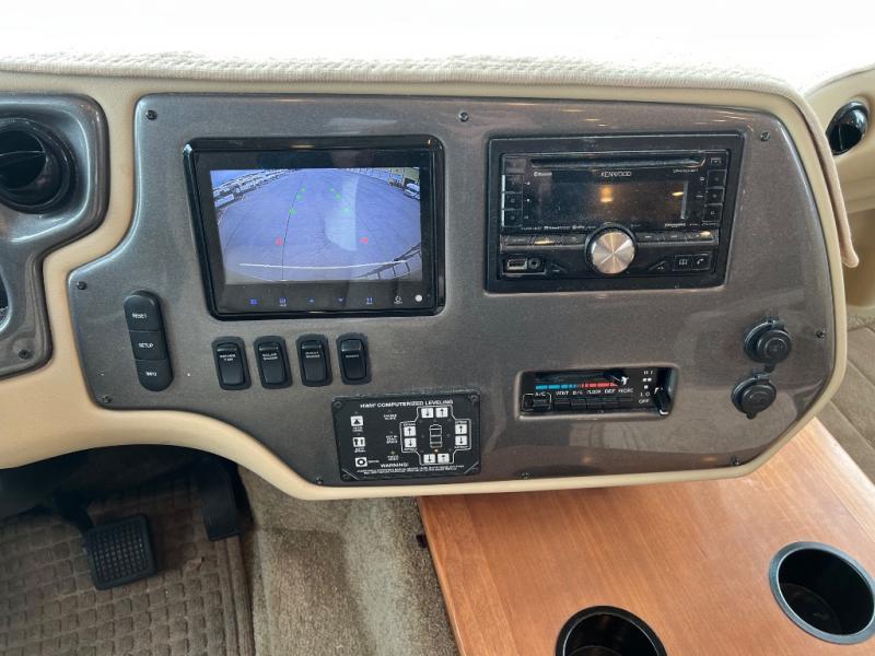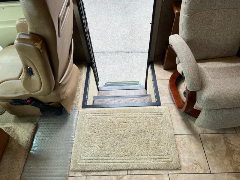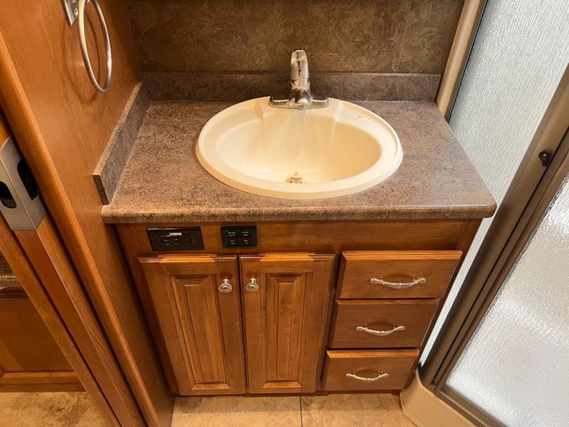 A large slide out on the driver's side has a sofa bed, a booth dinette and overhead cabinets. A standard TV with a pantry below is on an inside wall and the TV faces the front of the coach. In place of the booth dinette, you may choose a dinette with computer workstation.