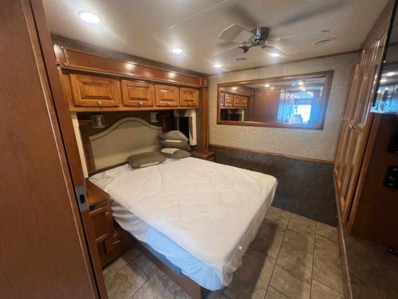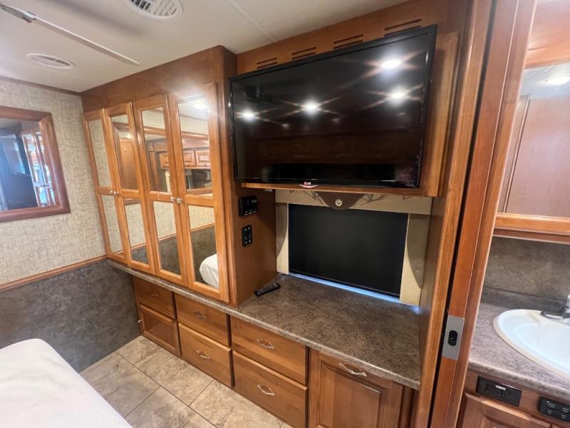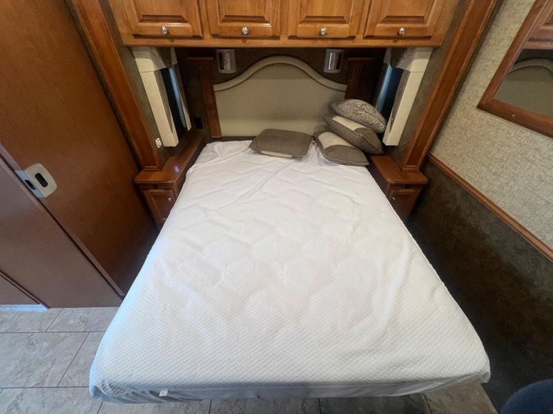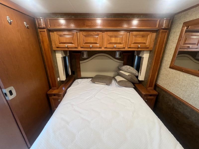 This class A motorhome includes a rear bedroom with a queen bed slide. There are nightstands at each side of the bed and overhead cabinets above. A wardrobe with drawers below and a cabinet with a TV above are on the wall opposite the bed.