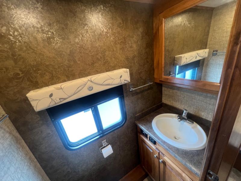 A split bathroom includes a sink, medicine cabinet, corner shower and overhead cabinets on the road side. A private area with toilet, sink, and medicine cabinet is across the hall.