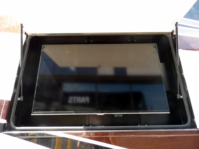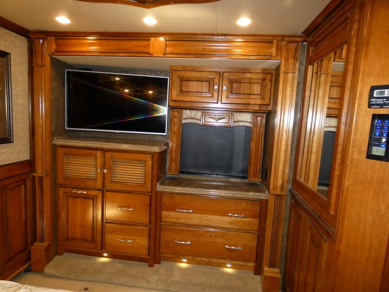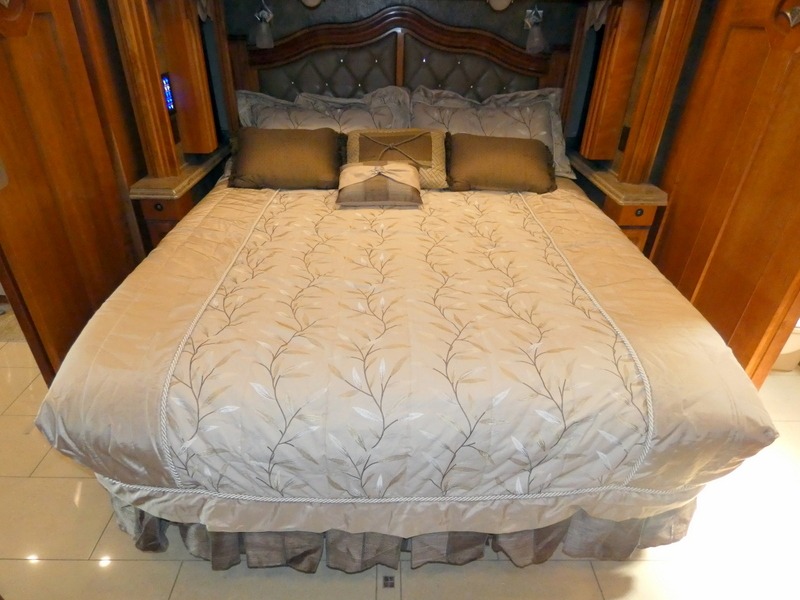 The bedroom is next with a slide-out bed including nightstands on both side. The slide opposite features a counter area with drawers beneath, and a TV plus overhead cabinets for storing some of your things.