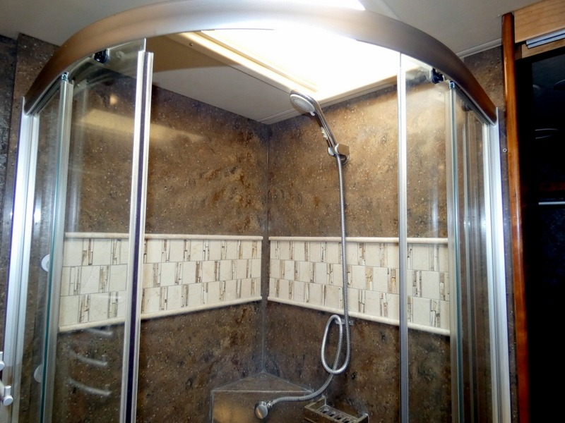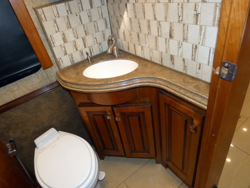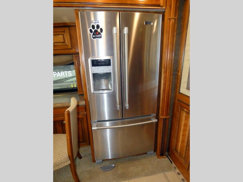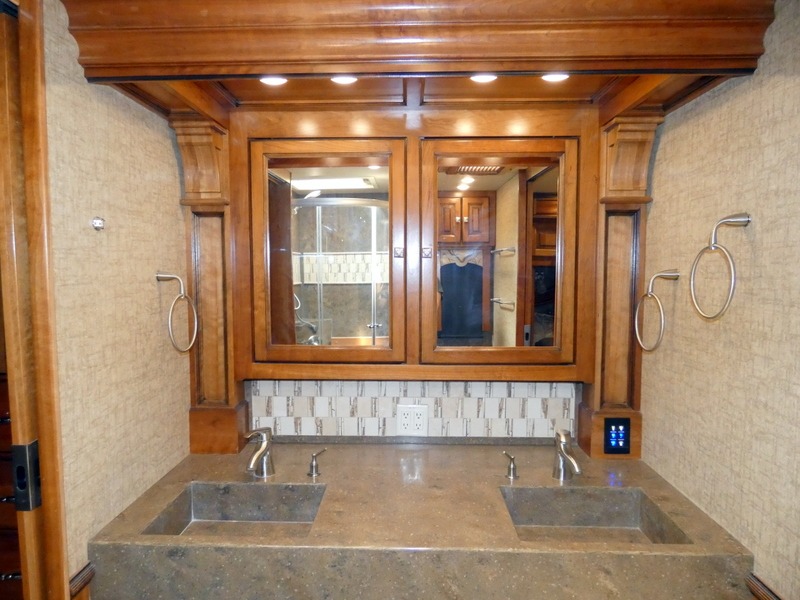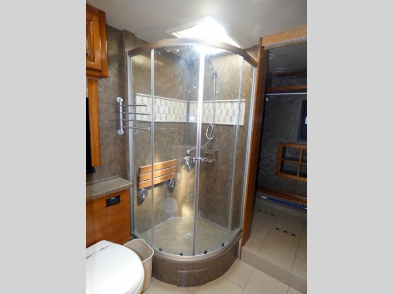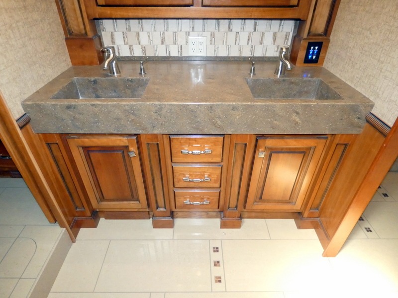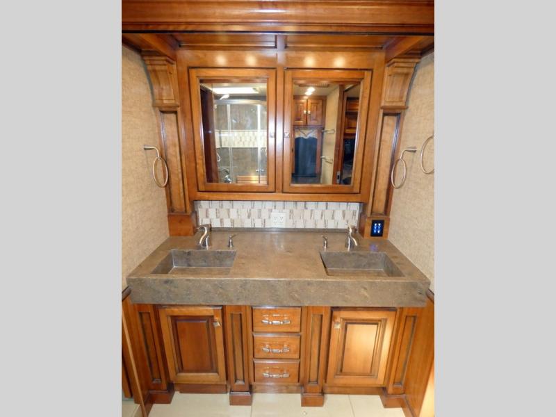 The living area and kitchen are found up front with two large slides opposite one another. The passenger side features a dinette with computer work station off to one side, and a residential refrigerator just like home. Off the driver's side you have an L-shaped chaise sofa with coffee table, kitchen counter, range with microwave above, and double kitchen sink. Plus you may choose to add a drawer type dishwasher for easy cleanup.