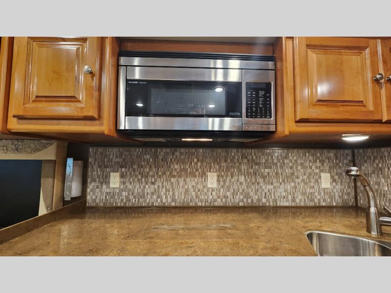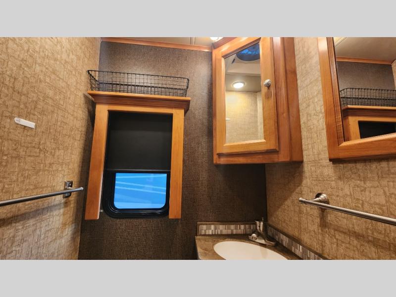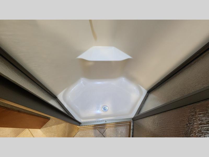 A standard TV faces the front of the coach along the interior living room wall, and you can add an optional fireplace for those cool chilly nights when you want to just stay inside.