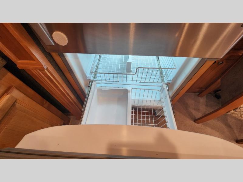 The road side provides a slide out with a generous u-shaped dinette including overhead cabinets, a partial pantry, a two-door refrigerator, and another full pantry. You may instead choose to have the slide include a lounge chair, dinette with computer workstation, overhead cabinets, refrigerator and pantry. You may also select an optional residential refrigerator for more conveniences.