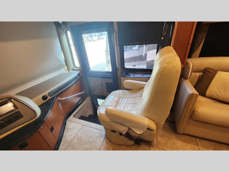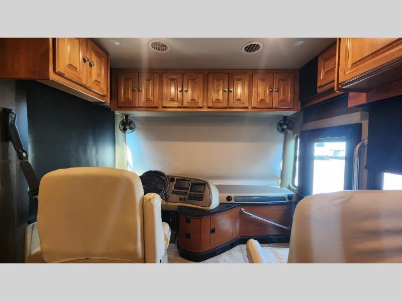 The front cab area features swivel captain and passenger chairs providing added seating when parked. There is plenty of storage in overhead cabinets along the front and both sides, plus you can choose to add an optional TV if you wish.