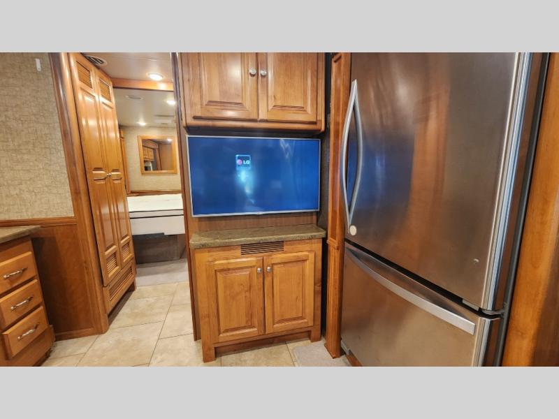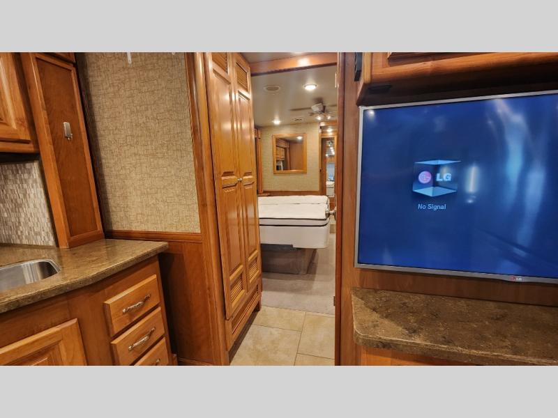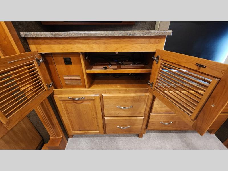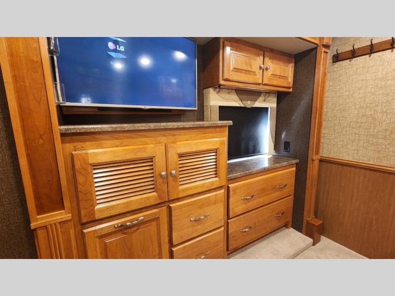 Next enjoy a bedroom area with slide out queen or optional king bed with nightstands at each side plus overhead storage. The wall opposite the bed has another slide that features a bank of drawers with overhead cabinets and a TV.