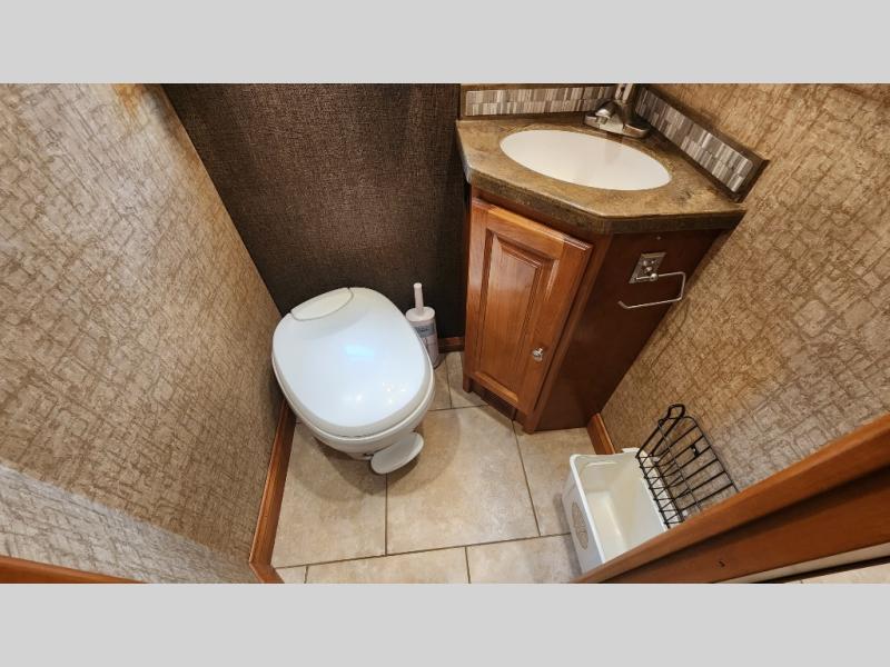 Directly across from the optional washer and dryer find a centrally located half bath with toilet and vanity with sink, plus overhead storage for added convenience.
