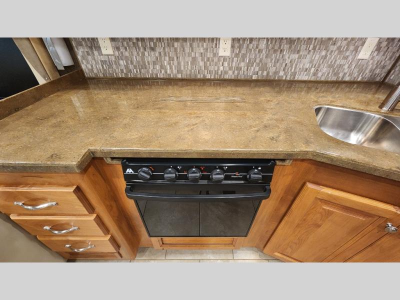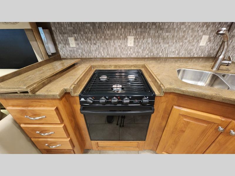 The curb side provides a slide out sofa, lots of overhead cabinets, a three burner range, overhead microwave, and angled kitchen sink. A closet for an optional washer/dryer is just off the slide out before the bedroom area.