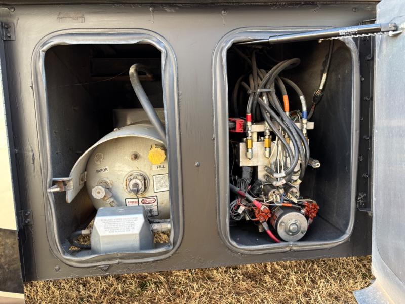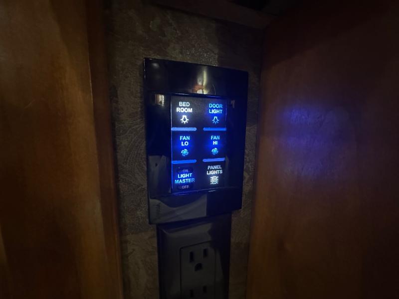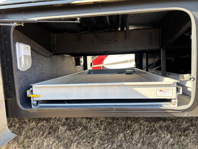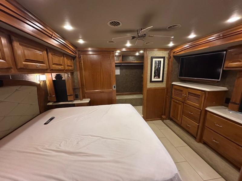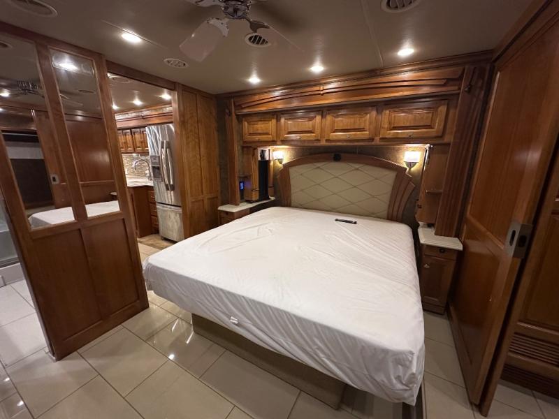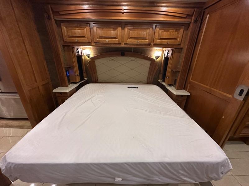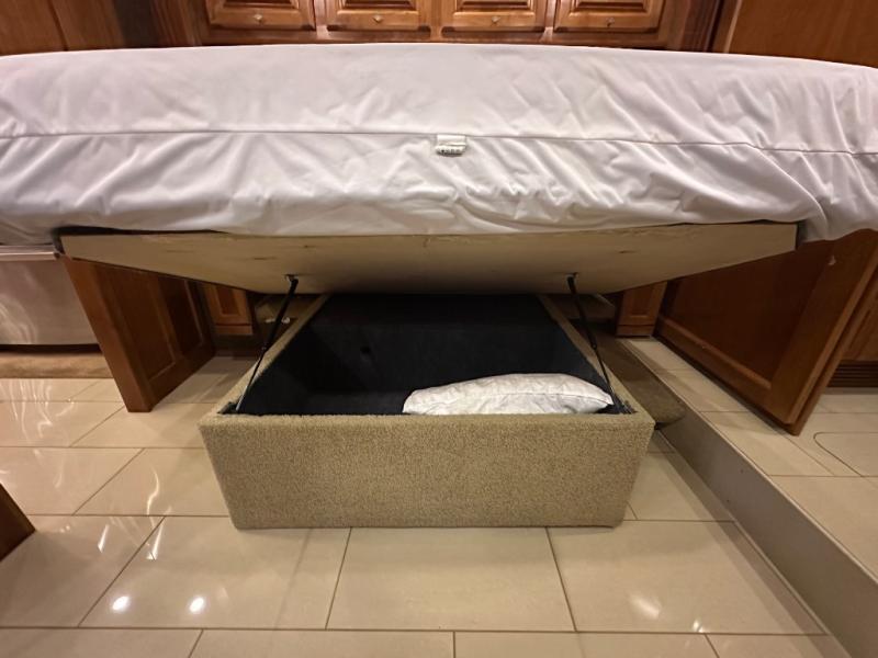 Moving into the master bedroom, the queen size bed (king optional) with nightstands at each side and overhead cabinets is on a slide. The wall opposite the bed includes a large slide that starts in the bedroom with an overhead TV, overhead cabinets and drawers below.