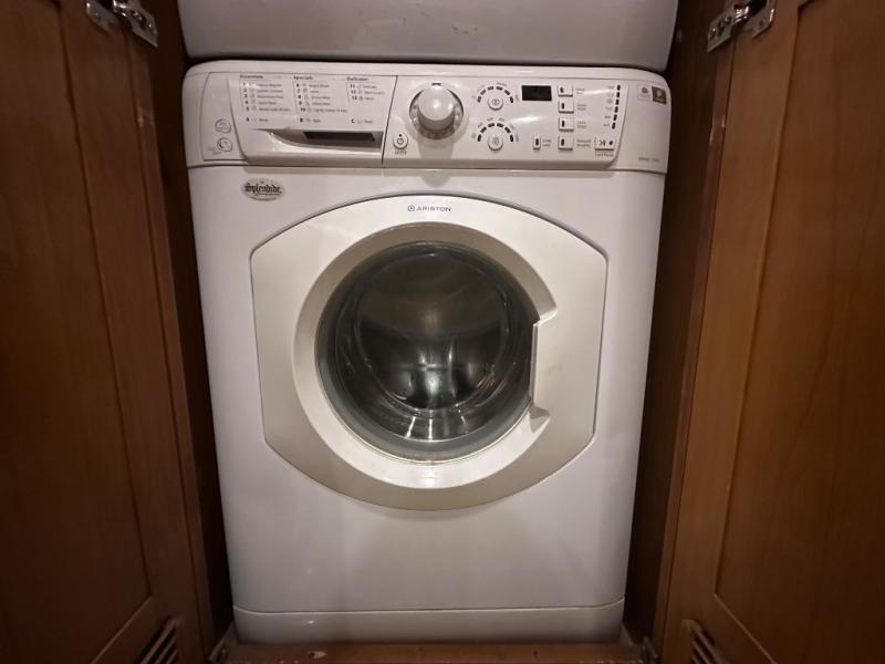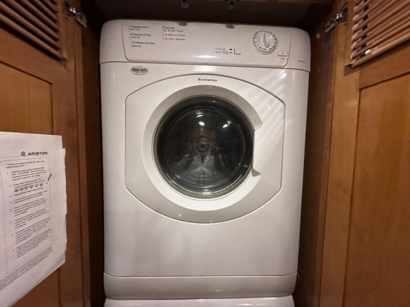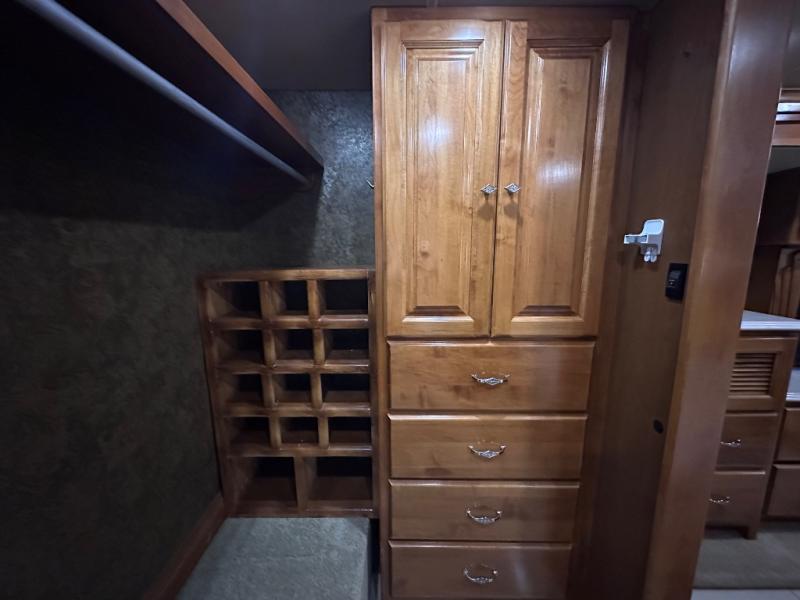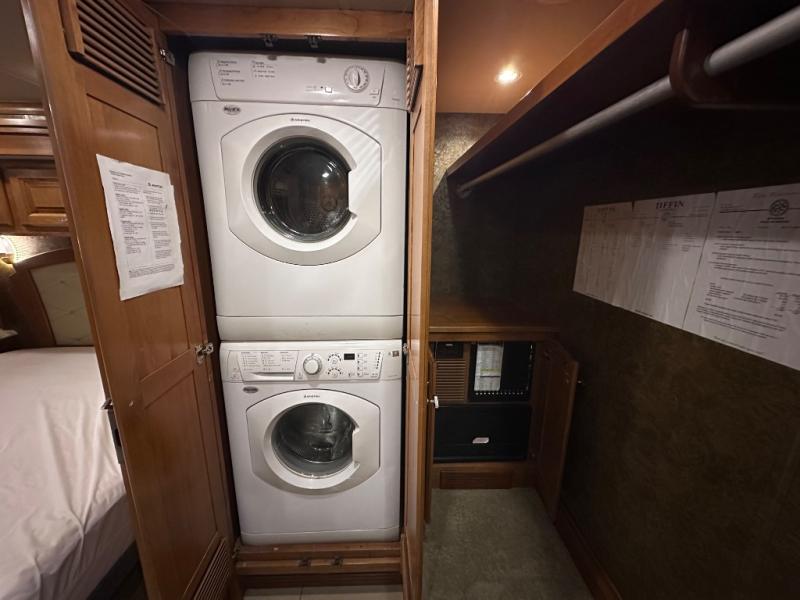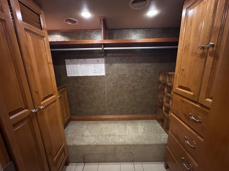 At the rear of this class A diesel coach there is a shelf with hanging rod below, drawers, and a closet for an optional washer/dryer all within a walk in wardrobe.