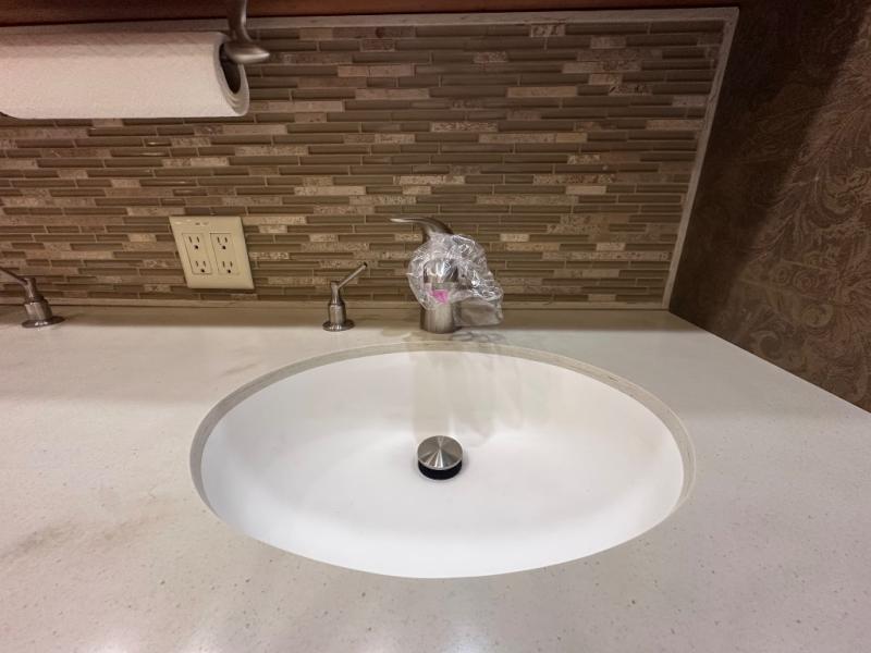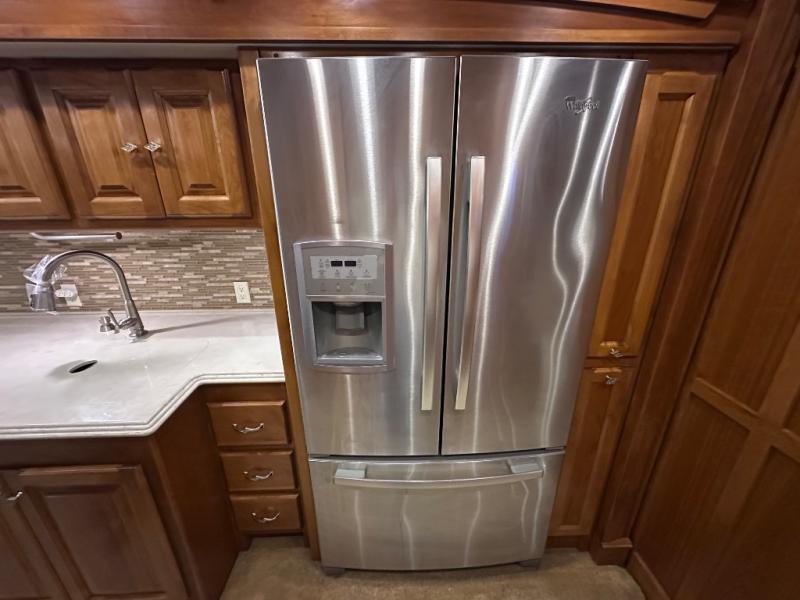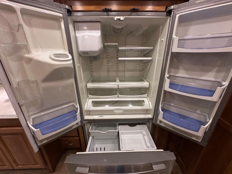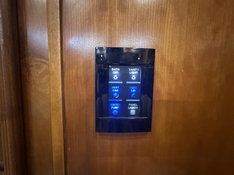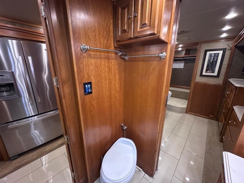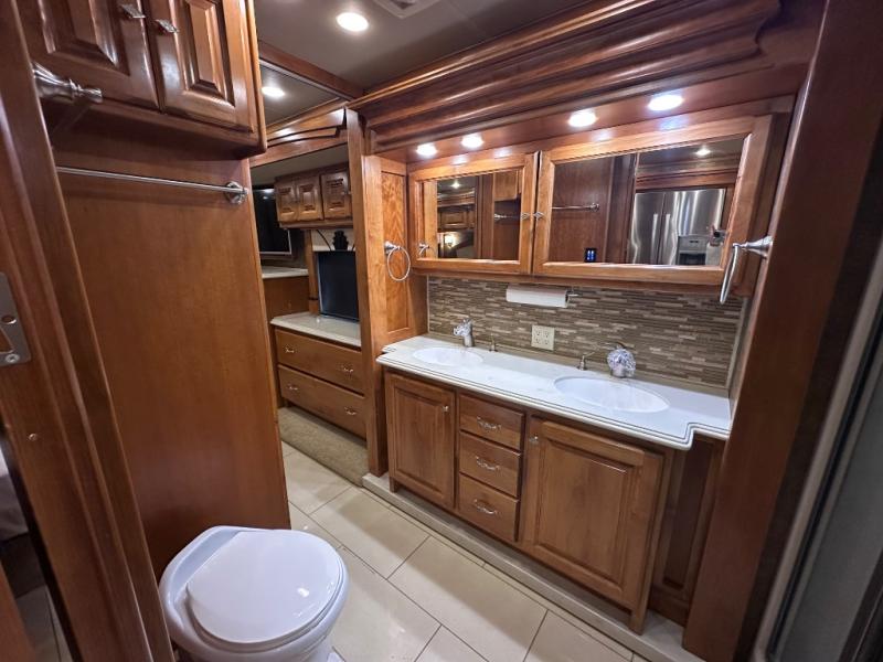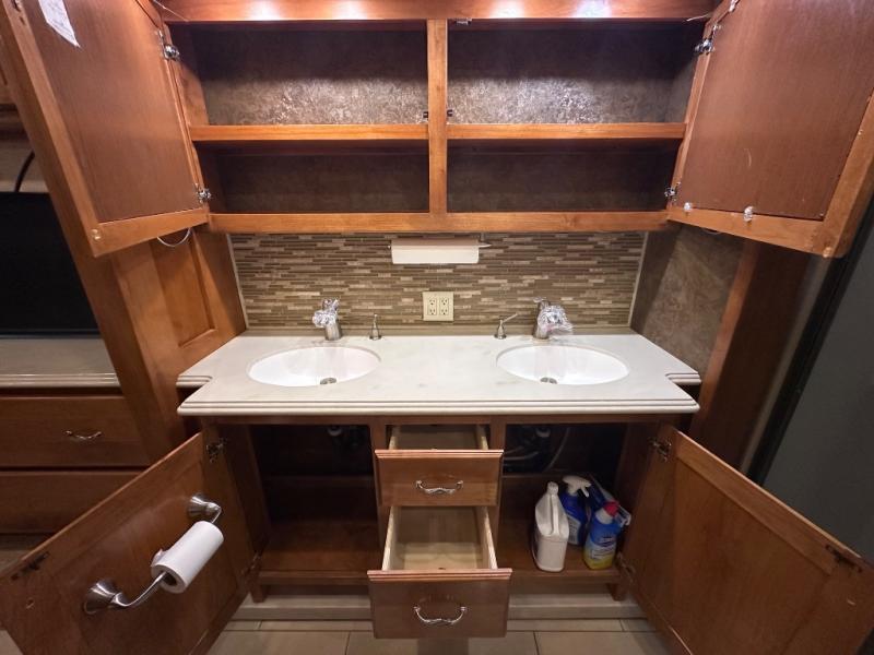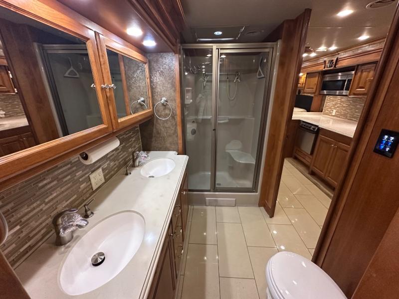 The slide out continues into the side aisle bathroom with his and her sinks and overhead cabinets. The bath also includes a toilet, a shower and access from either the bedroom or the living area.