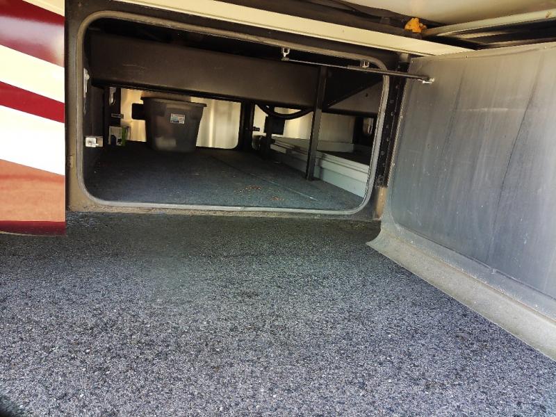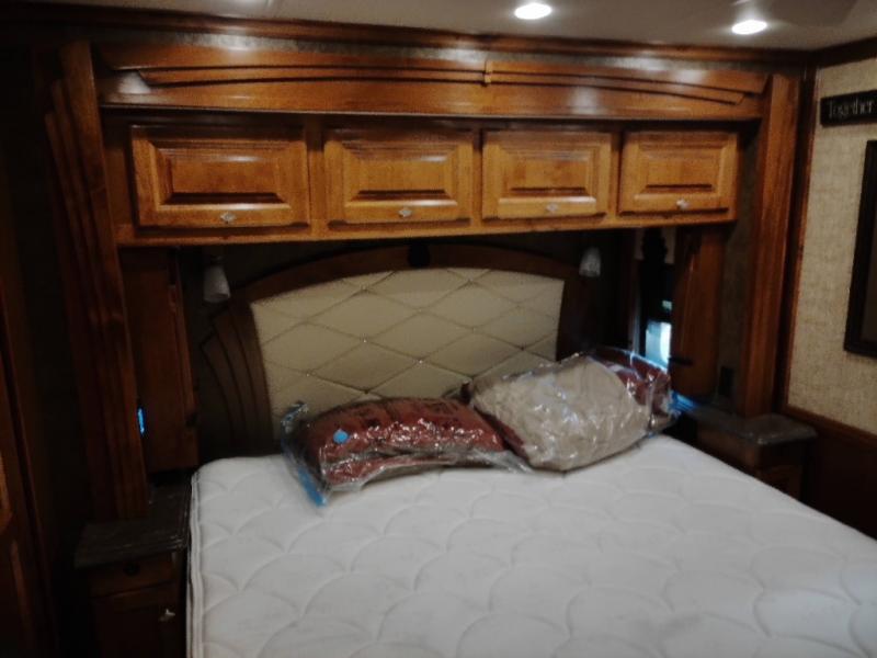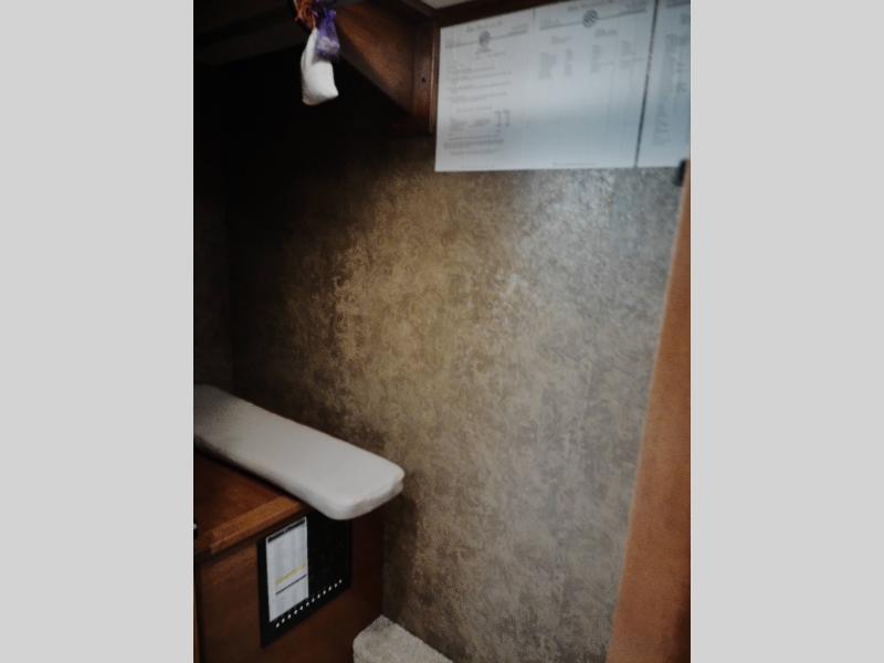 The bedroom has a queen bed slide out with nightstands on either side of the bed and overhead cabinets above the bed. You may even choose an optional king size bed. The wall opposite the bed has a slide with an overhead TV, overhead cabinets and drawers below.