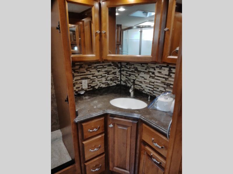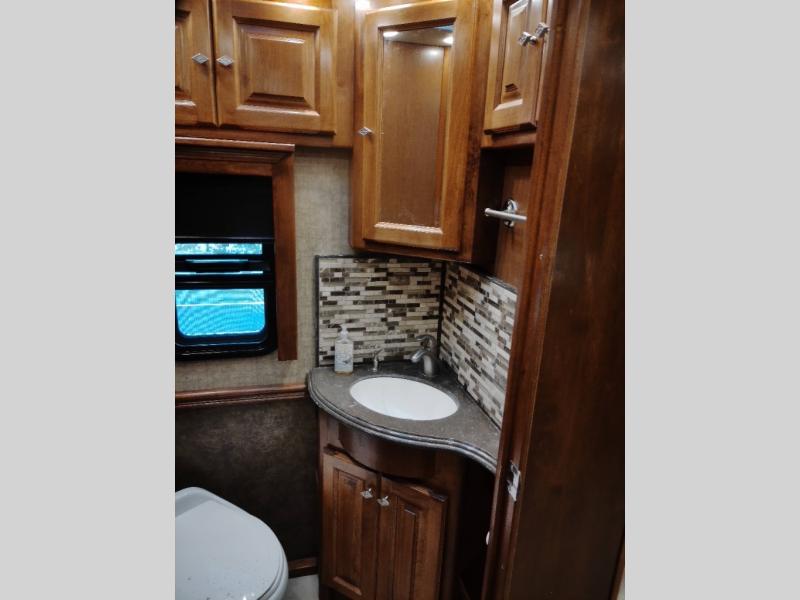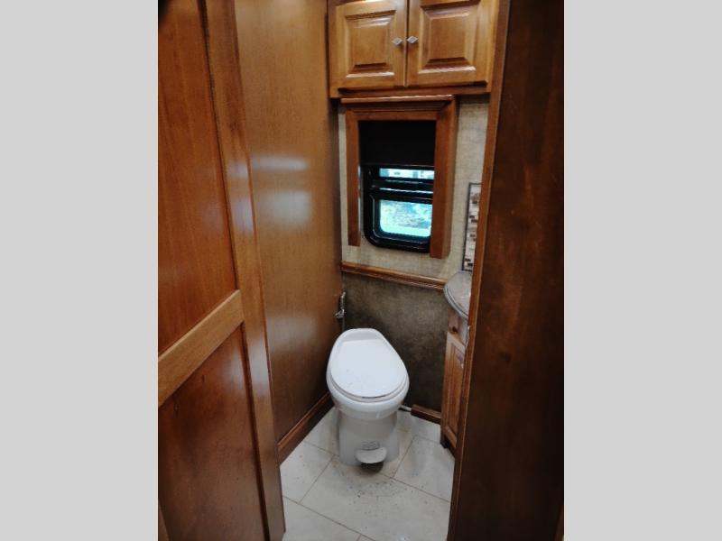Moving toward the back, a side aisle half bath is on the right side of the motor home and includes a toilet and vanity sink.