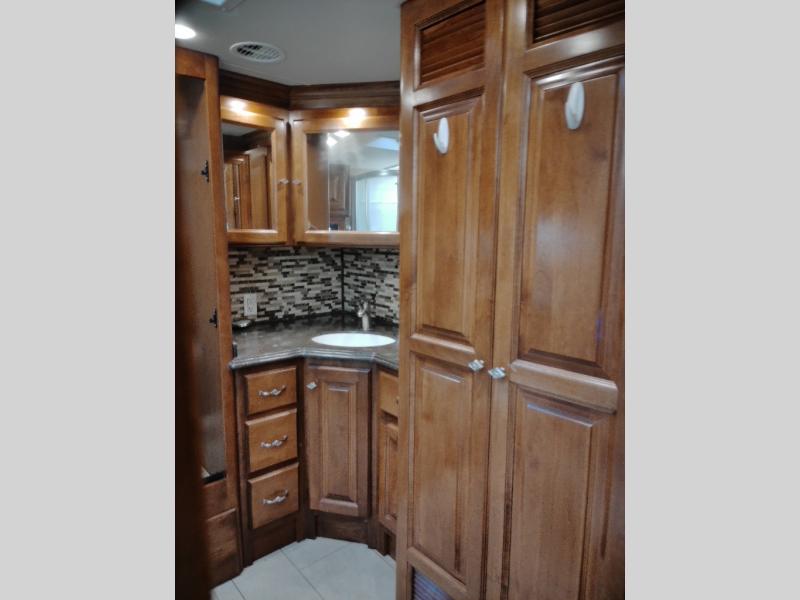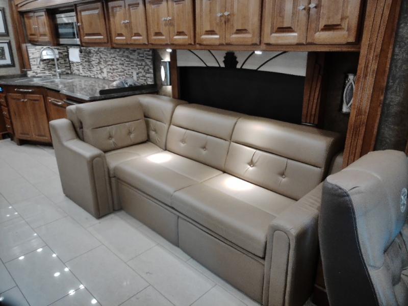 Step into the coach and find two slides in the main living area. The first slide has a TV with an optional fireplace below the TV, sofa, booth dinette, and residential refrigerator. You can choose a few options for this slide such as an entertainment center with leather recliners, entertainment center with one ultra leather recliner and flip table, leather recliners, dinette with computer workstation, and u-shaped booth dinette. Along the front of the cab there is an optional TV. The other slide has a chaise sofa bed, microwave, stove, optional dishwasher below the stove, and double kitchen sink.