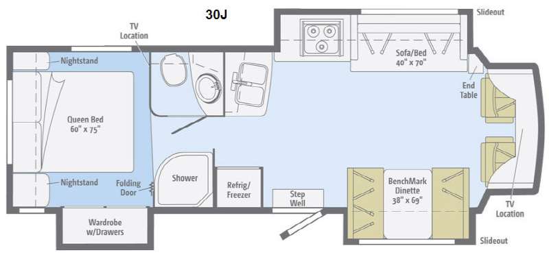 Step inside model 30J and see just how convenient your travel time will be. There are dual opposing slides in the main living space with a slide out BenchMark Dinette to the right as you enter. There are three sets of seat belts making travel for your guests safe, plus this can also be used for additional sleeping space for one extra guest.