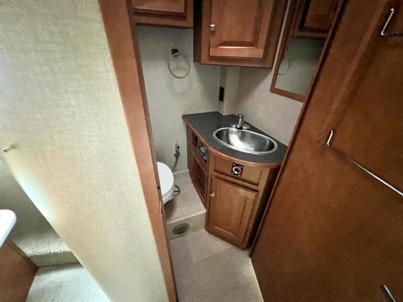 There is a folding door that closes off the bedroom space for more privacy. Here you will enjoy sleeping on a 60" x 75" queen size bed with dual nightstands, plus a slide out wardrobe area including drawers. A nice TV location is along the outer toilet area wall where you will enjoy a 22" DC HDTV.