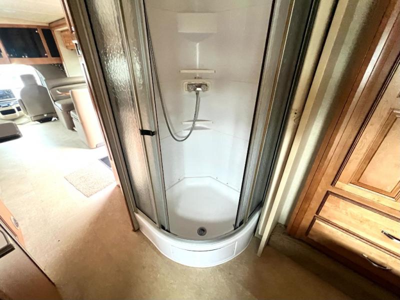 Head toward the rear of the coach and walk-through the bathroom area with corner shower on your left and private toilet area and vanity with sink on your right.