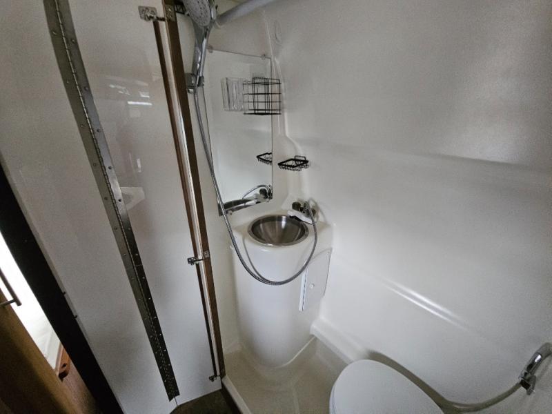 A side bath/shower area is located along the road side and features a toilet, and sink with bi-fold doors. A handy wardrobe for your clothes is located opposite.