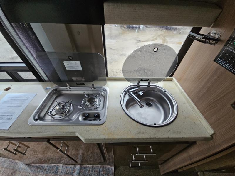 To the left of the entrance there is a TV location for a 22" HDTV, a two burner range top with glass cover, a round sink, overhead cabinets, and the refrigerator is found opposite next to the sofa bed. There is also a small storage cabinet next to the refrigerator.