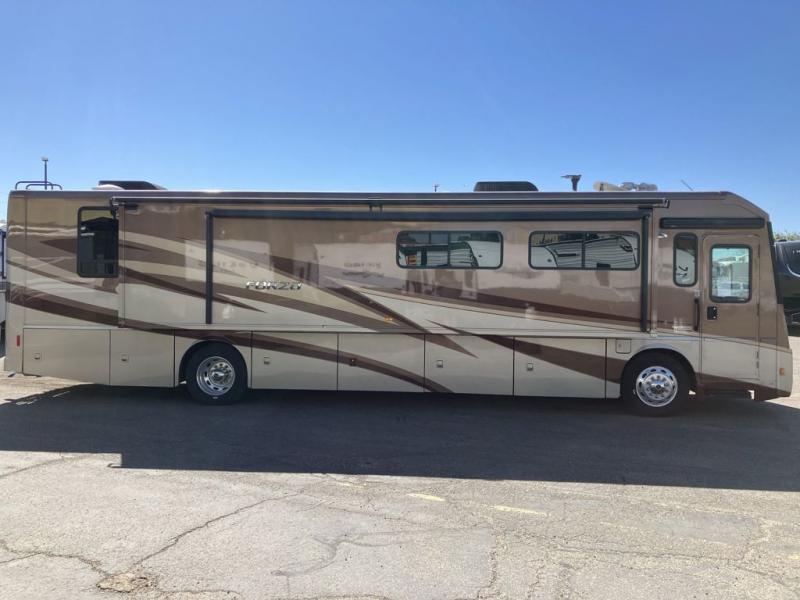 A full wall slide, bunk beds, and a bath and a half are what make this Forza class A diesel standout. This unit easily sleeps 7 and makes a perfect traveling home.