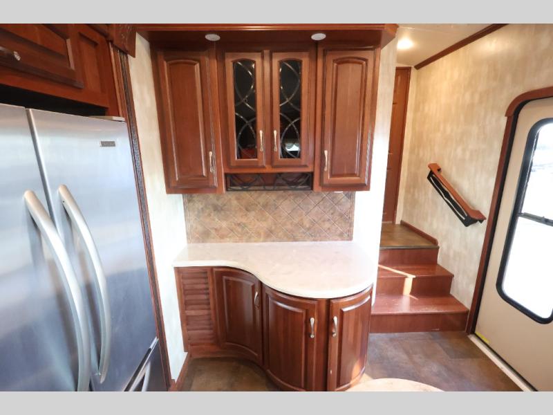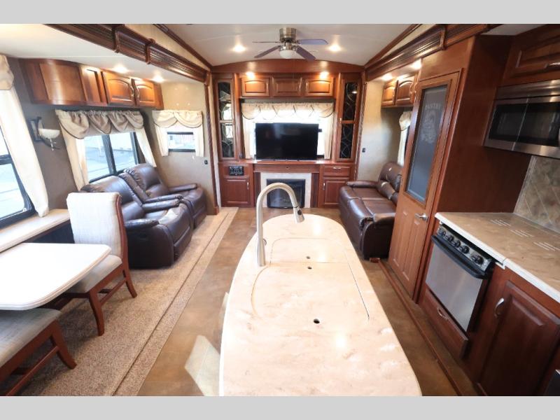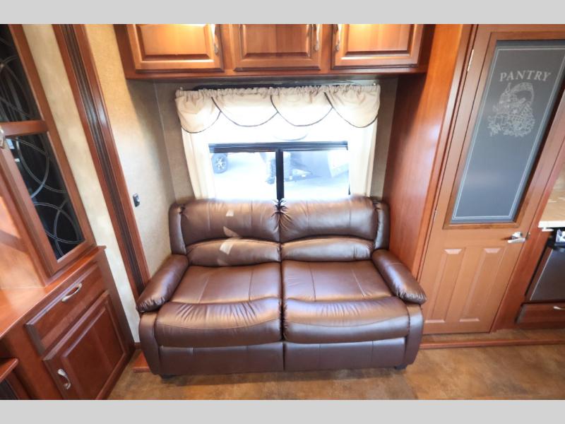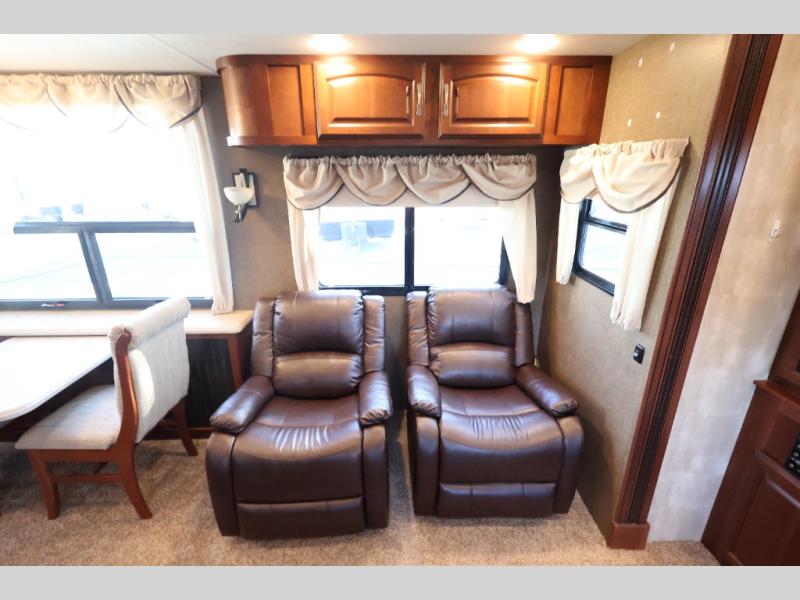 As you enter notice how open the interior is with dual opposing slides in the main living area. There is a dining table with two chairs and two recliners with overhead storage in a slide to the left of the door. Straight ahead find a buffet area with overhead storage, plus lower cupboards for things as well.