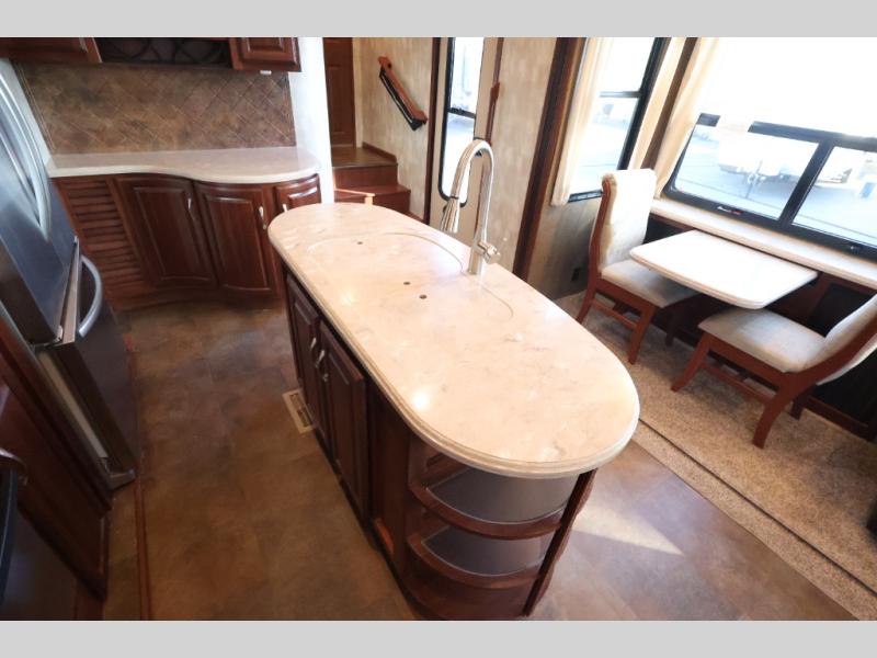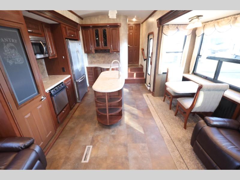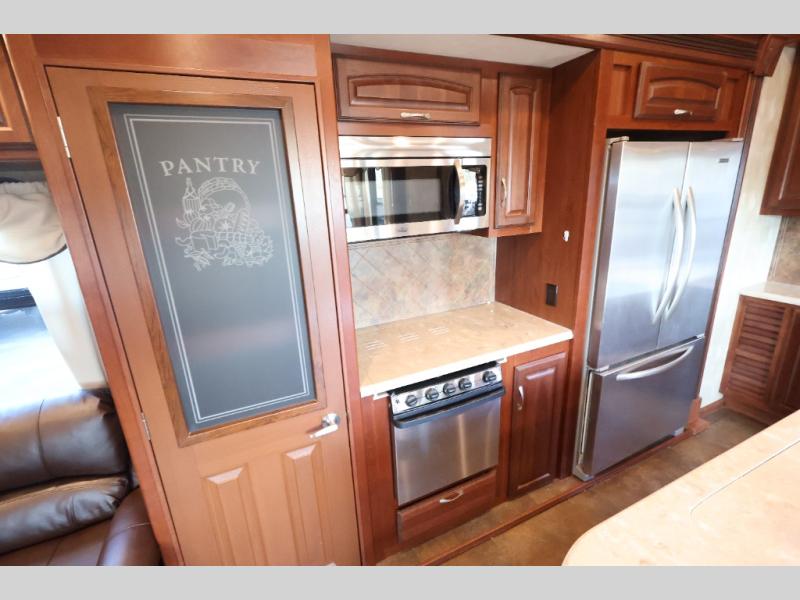 The slide opposite the door features a refrigerator, three burner range with overhead microwave, a large pantry, and a tri-fold sofa. The kitchen island off center features the kitchen sink.