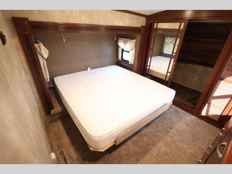 The front master suite is spacious and provides a queen bed slide with nightstands on both sides, a dresser opposite the bed, a wardrobe for all of your clothing storage and a washer/dryer prep along the front wall, plus so much more!