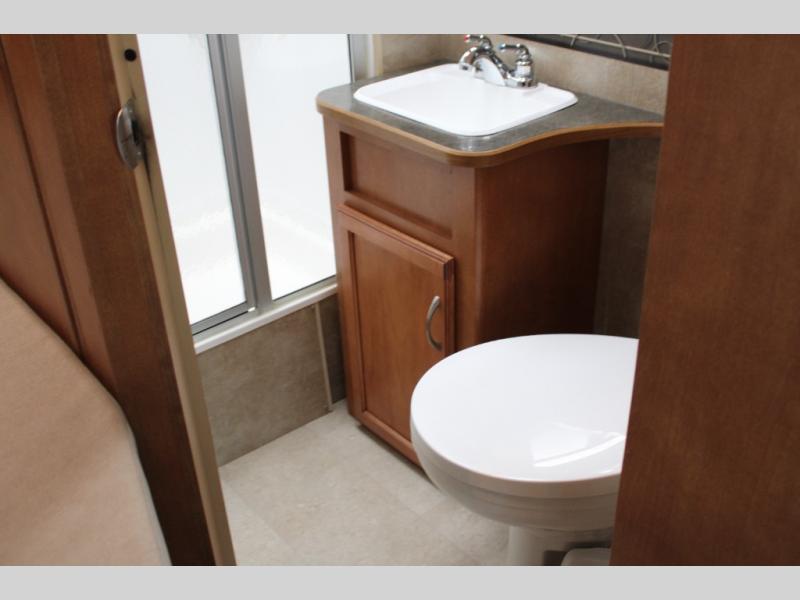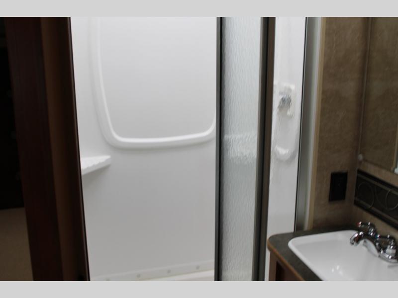 The rear curb side corner features a double bed with overhead storage above the head of the bed, and a shirt closet above off the rear of the bed. In the opposite corner find a complete bath with shower, toilet, and vanity with sink, plus so much more!