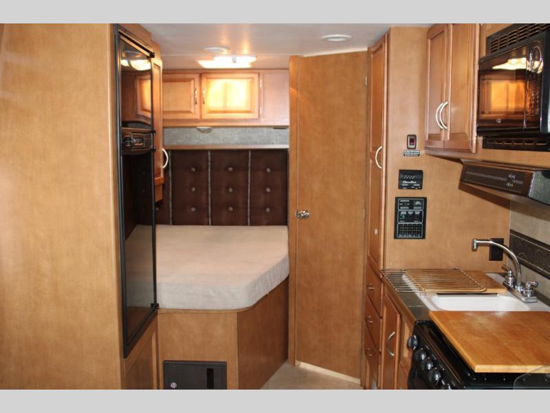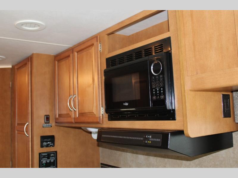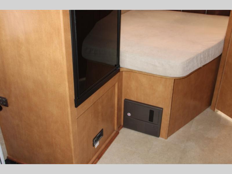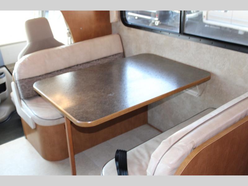 To the right of the entrance find a 42" x 69" dinette with two sets of seat belts for safety along with a sofa bed opposite including two sets of seat belts as well. This makes it easy to have five passengers all buckle in while moving to and from your travel destinations. There is plenty of overhead storage above both the sofa and dinette to help keep things neat and organized.