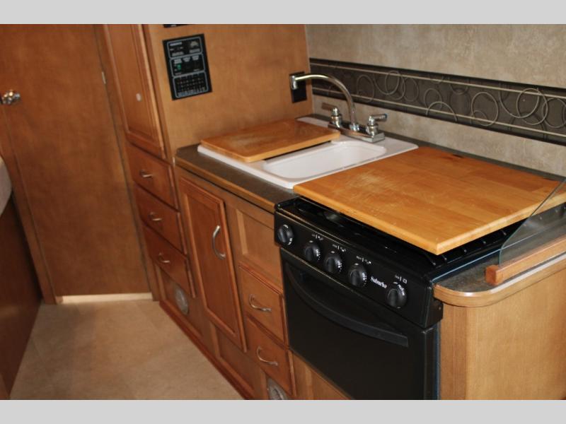 Step inside and notice the kitchen area straight ahead. There is a three burner range and double sink opposite the door along with a refrigerator to your immediate left as you enter.