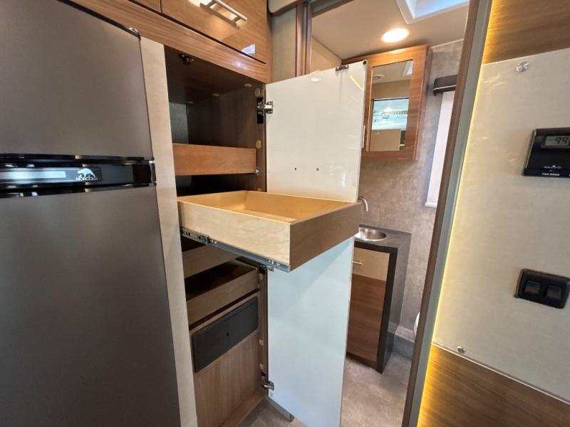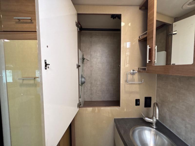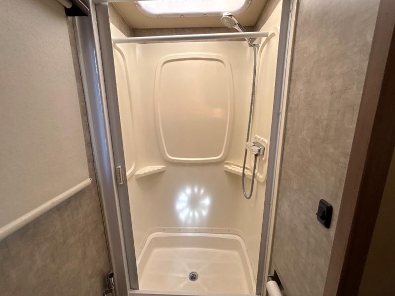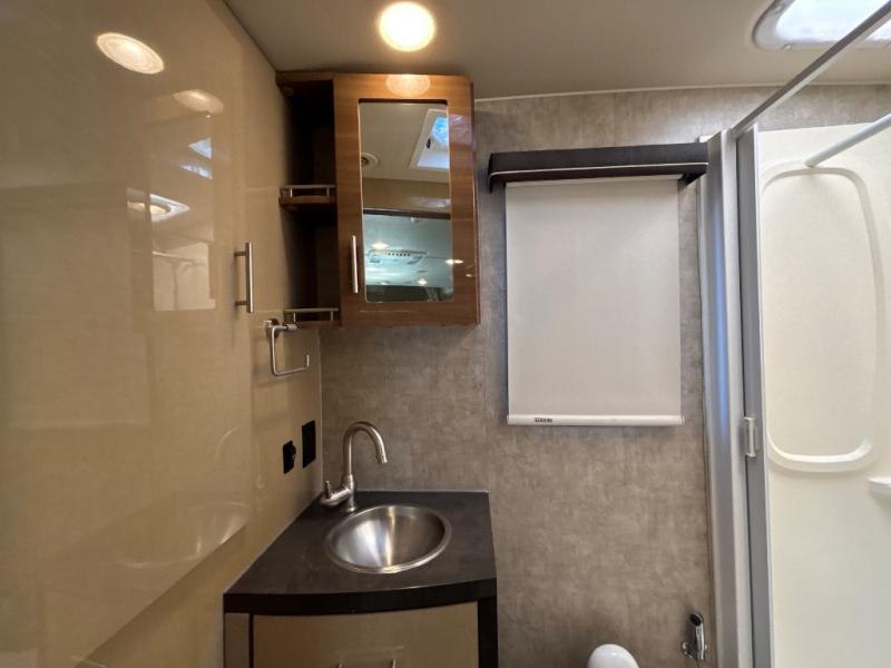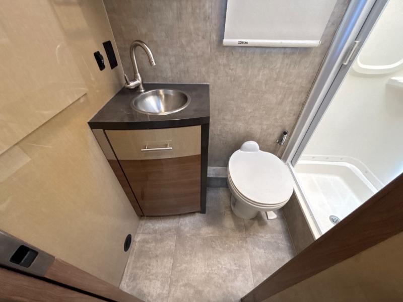 The rear bathroom is spacious for a coach this size, featuring a shower, vanity, and storage. With large windows, LED lighting, and Winnebago’s attention to detail, the Navion feels bright, modern, and functional.