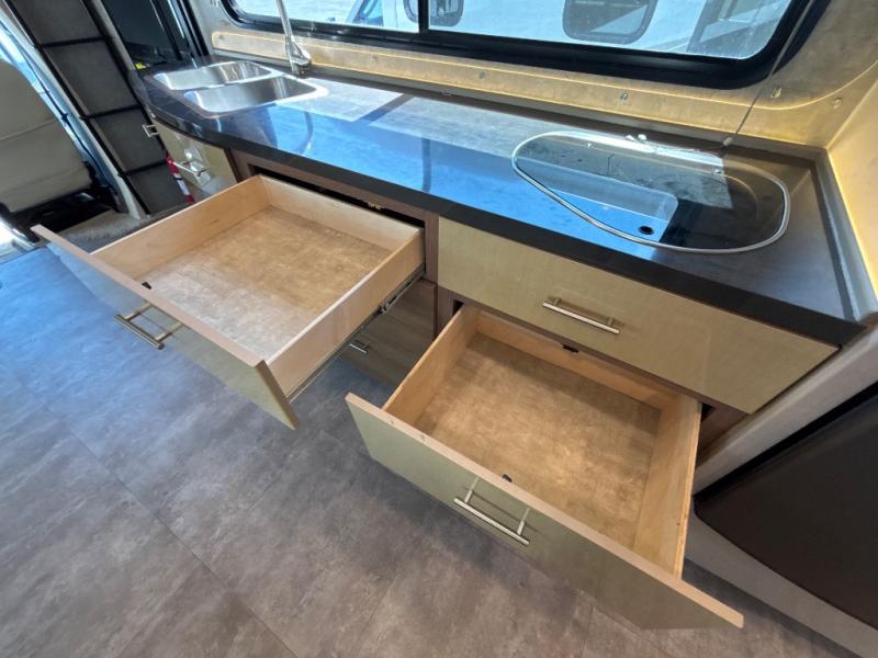 Inside, the Navion 24M offers a flexible living area that transforms quickly from daytime lounge to nighttime comfort. The Murphy bed folds down over the sofa, while the dinette provides additional seating and sleeping options. The kitchen comes well-equipped with a convection microwave, three-burner range, refrigerator, and solid-surface countertops, making meal prep easy on the road.