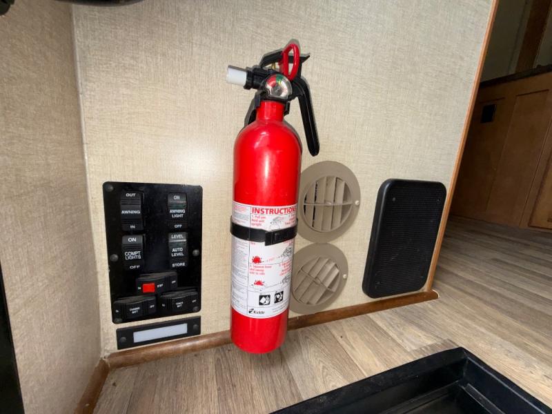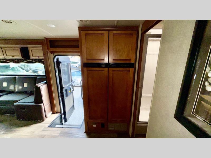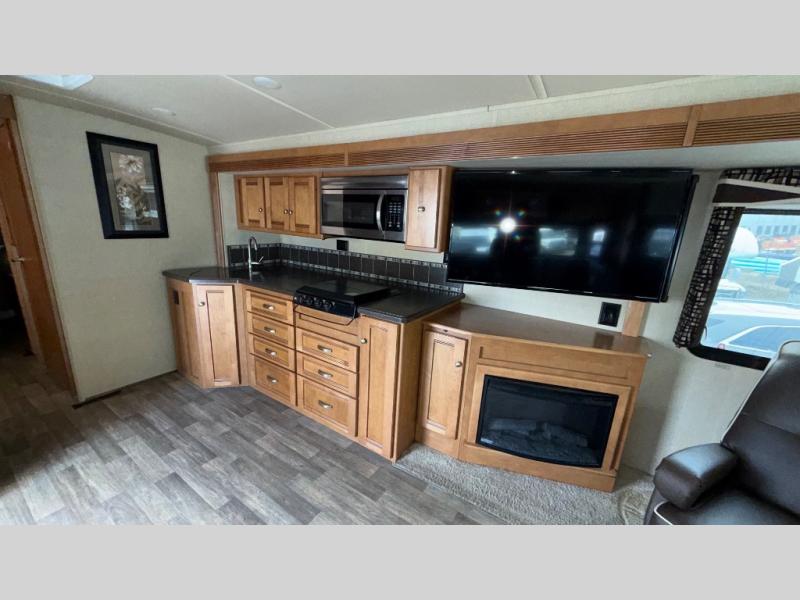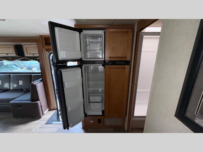 Step inside and find a large slide out inLounge to your right featuring seat belts, and the ability to extend for added seating. There is a slide opposite that features an inTable, recliner, 48" HDTV with electric fireplace below, counter space, a three burner range, and double kitchen sink. The 4-door refrigerator/freezer is opposite just to the left of the main entrance.