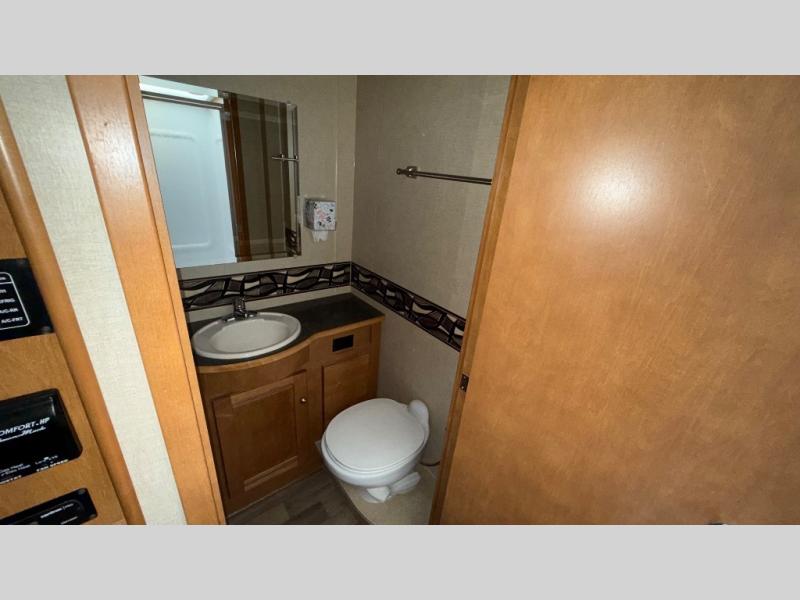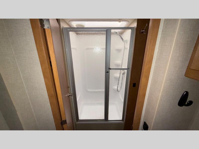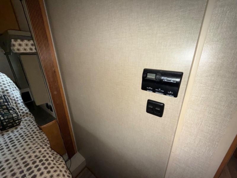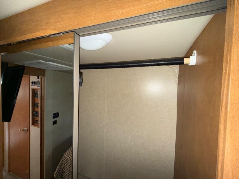 A second sliding door separates the bathroom from the bedroom and features a queen size bed slide with nightstands, wardrobe, chest of drawers along with a 28" HDTV above, and a storage cabinet that can also be used as the location for a washer and dryer if you wish to add, plus more!