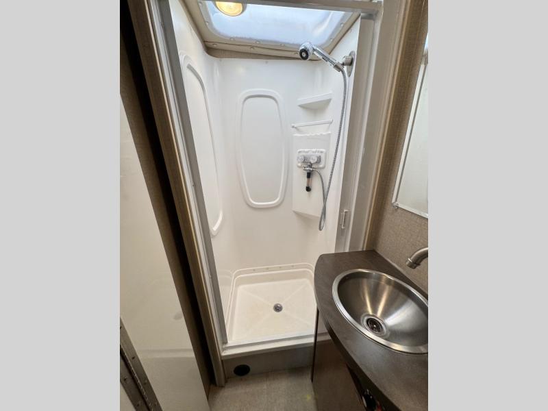 The opposite corner offers a bath with sliding door, shower, toilet, and sink, plus overhead storage, and so much more!