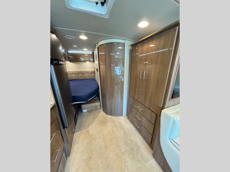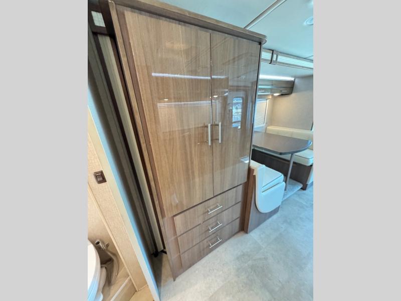 Step inside and see a BenchMark 42" x 75" dinette directly across from the door. It is featured in a single slide out along with a large wardrobe for storage. There is also a 32" HDTV for your viewing pleasure. You can choose a Comfort Sofa sleeper and storage cabinet instead if you like.