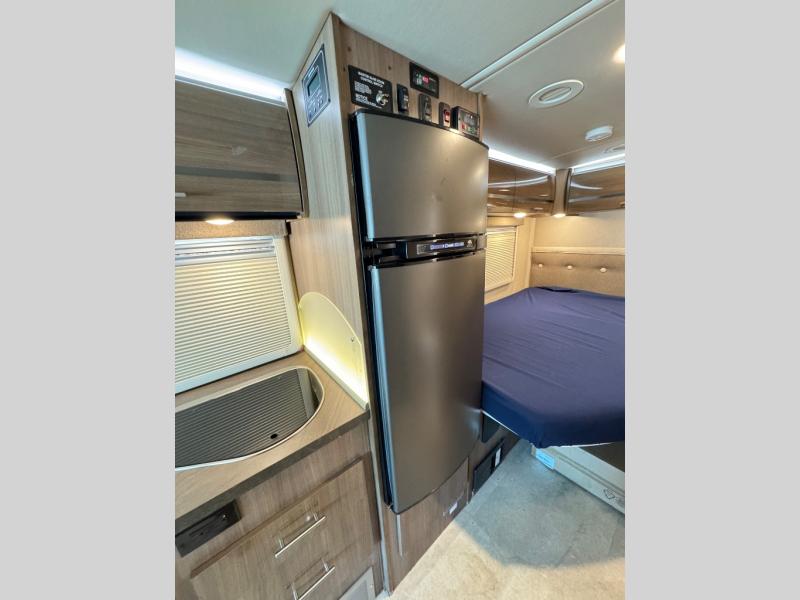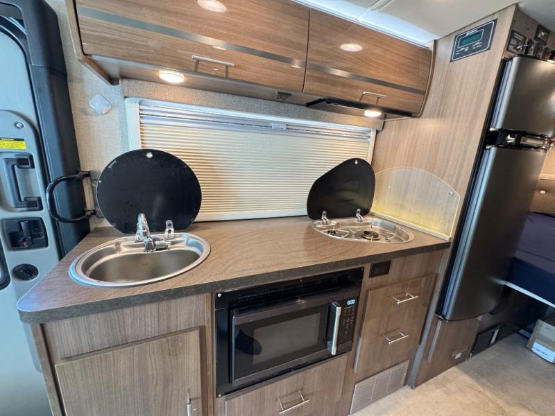 To the left of the entry door is a round kitchen sink, counter space, a two burner range top, and refrigerator. You will also find plenty of overhead cabinets for dishes and things.