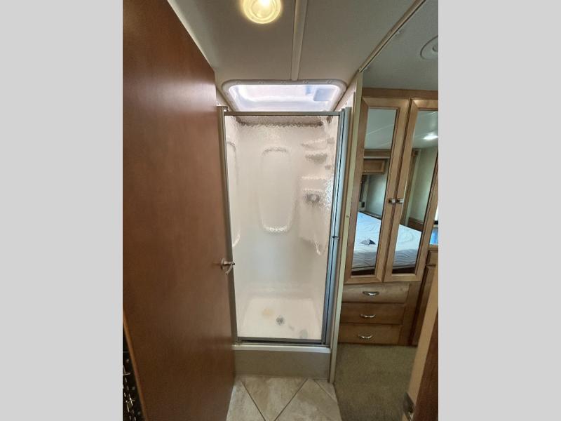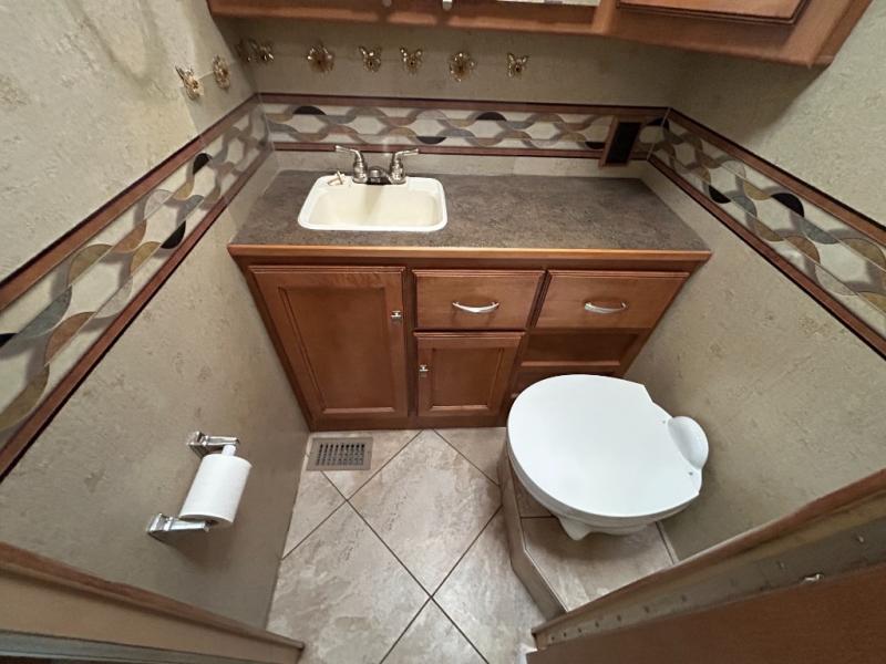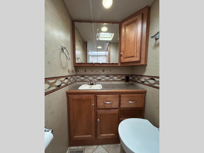 Head toward the rear bedroom and pass a shower on the left and private toilet area with vanity and sink with overhead storage on your right.