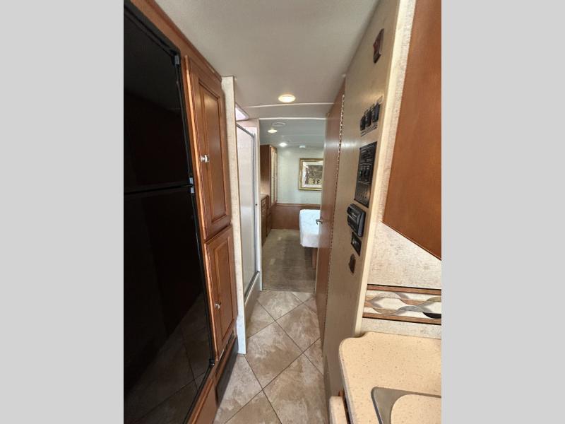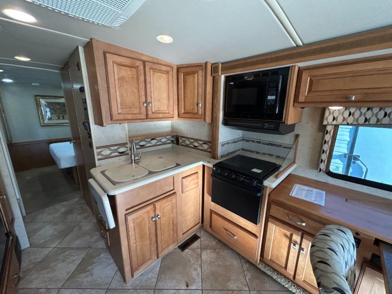 This class A coach features a wide open living area with dual opposing slides just behind the front cab seats that can swivel toward the rear for added seating. The slide to the right of the side entry door features a 48" x 70" sofa bed, or you can choose the 60" x 78" Comfort Sofa Sleeper. On the opposite side there is a slide out three burner range, and 42" x 74" booth dinette with seat belts. You can also select the optional dining table and chairs with buffet featuring a TV area, or a BenchMark Dinette instead. A refrigerator is located to the left of the entry door along with a pantry for storage, opposite the dinette slide is a double sink, plus overhead cabinets for storage.