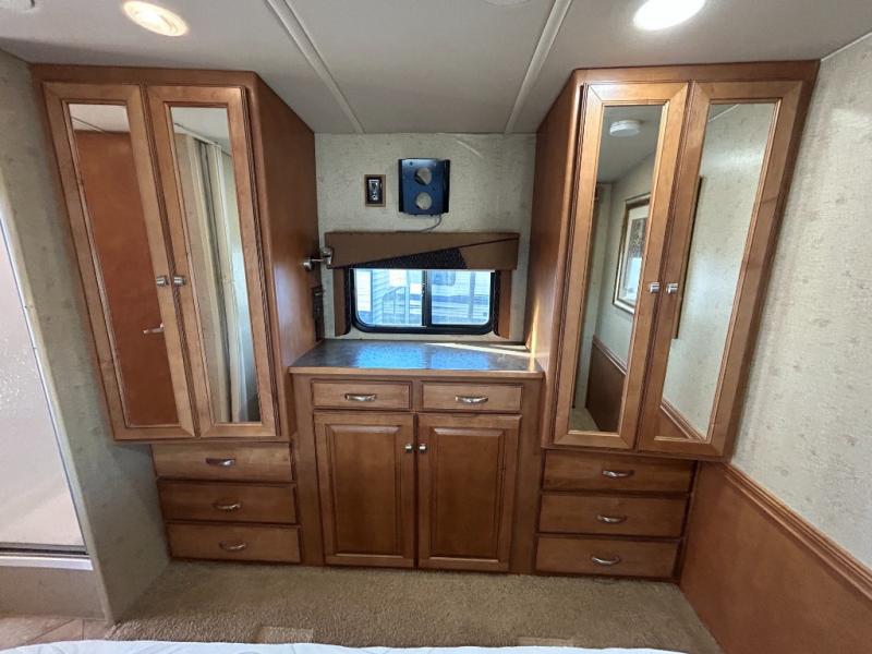 A folding door gives the rear bedroom a bit of privacy. There you will find a queen bed slide with nightstands and overhead storage, plus wardrobes and a storage cabinet with TV location between, and so much more!