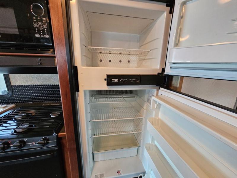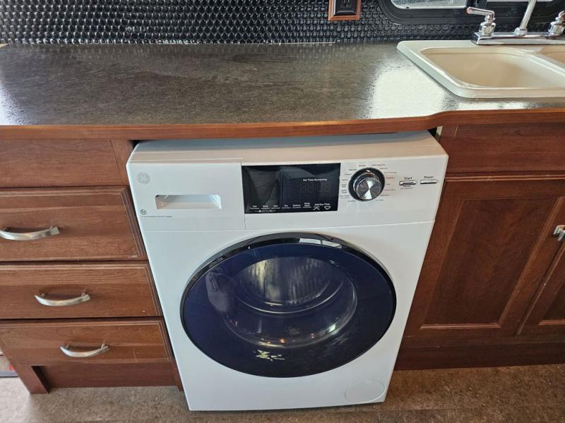 To the left of the entry door there is a counter area with location for a 32" HD TV, a double kitchen sink, and a three burner range, plus refrigerator. If you need more sleeping space choose the optional Studio Loft 32" x 79" bed that can be manually lowered, or choose a powered bed that is 32" x 89".