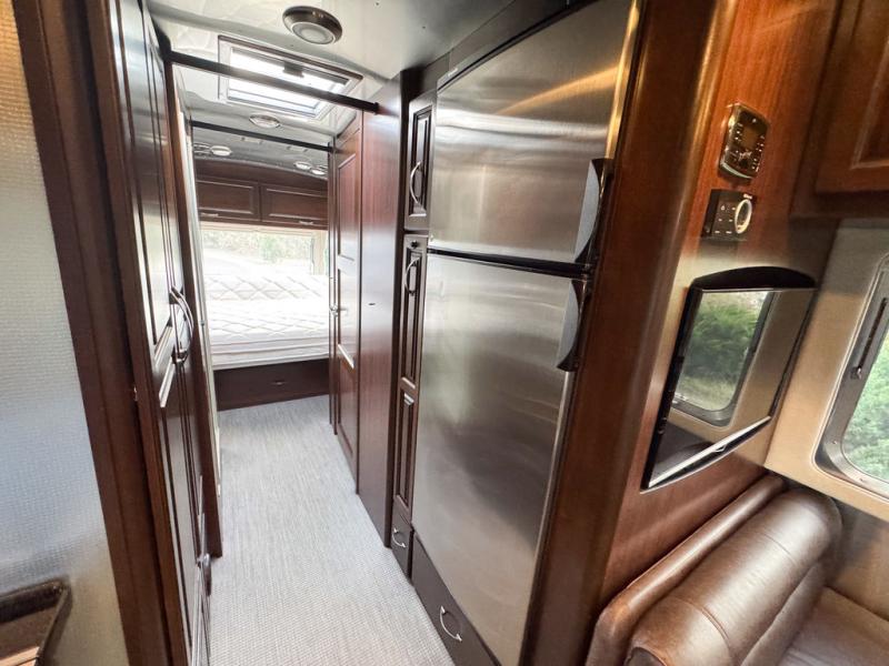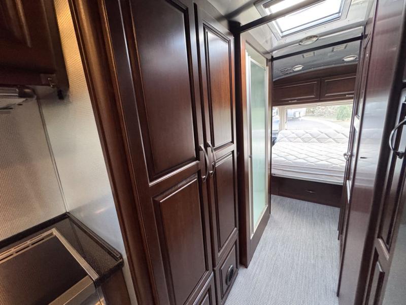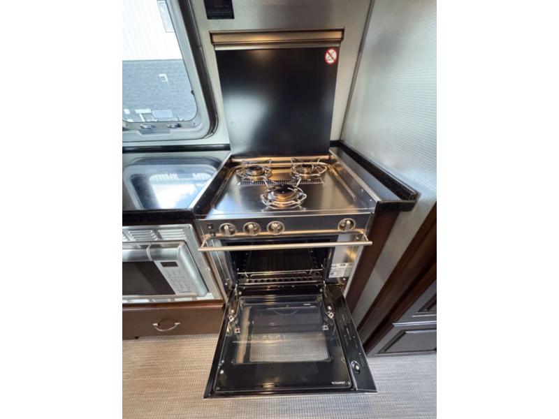 The galley has a double kitchen sink, three burner range. On the opposite side of the trailer you will find a dinette, LED TV above the dinette, refrigerator and slide out pantry.