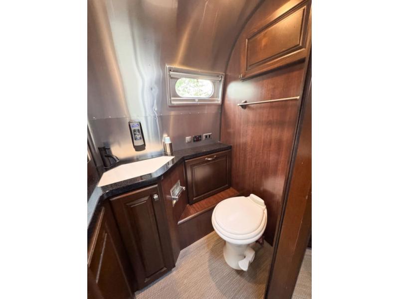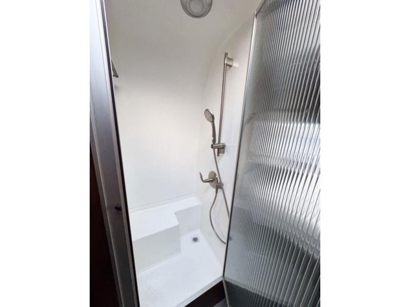 The bathroom has a private toilet area and sink on one side of the trailer. Across from the toilet area there is a shower and large wardrobe.