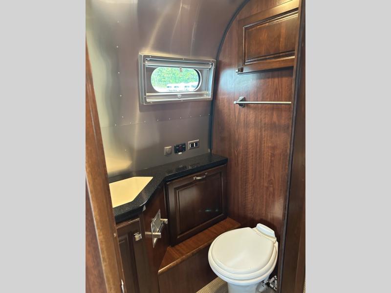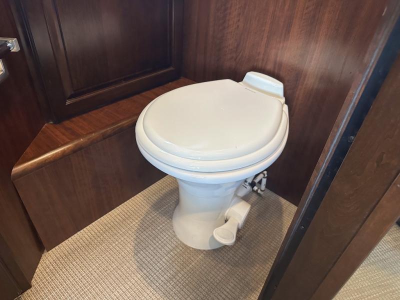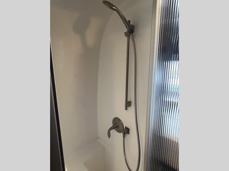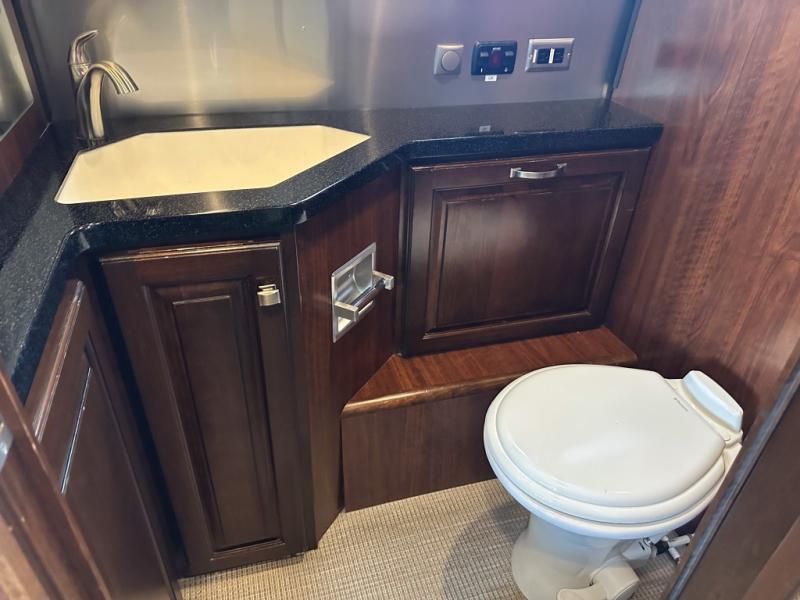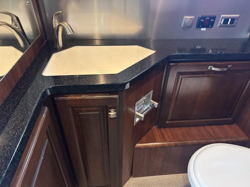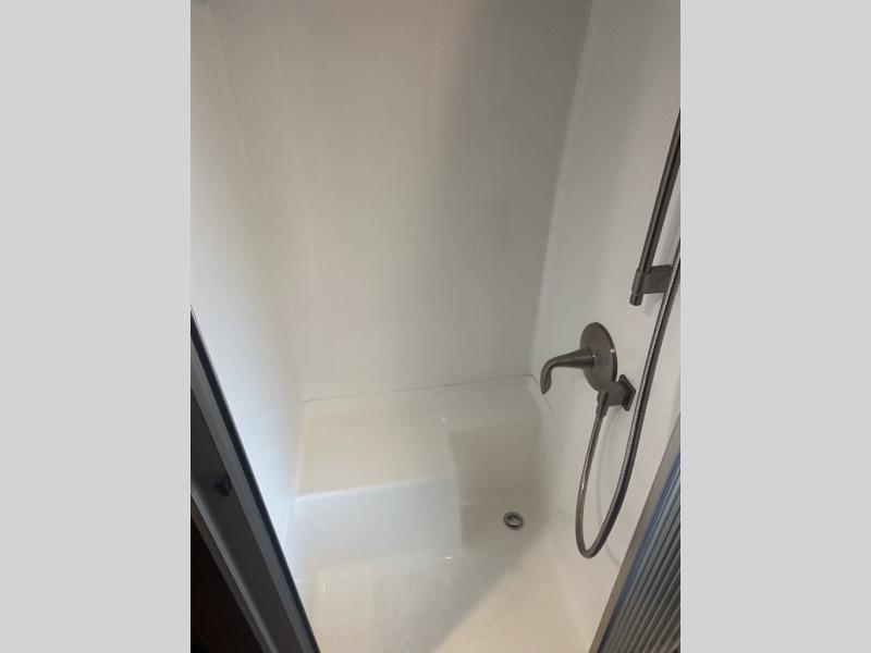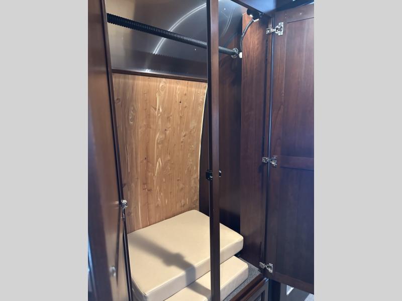 The bathroom has a private toilet area and sink on one side of the trailer. Across from the toilet area there is a shower and large wardrobe.