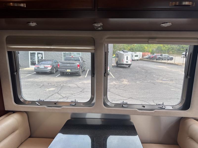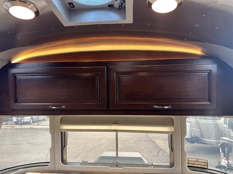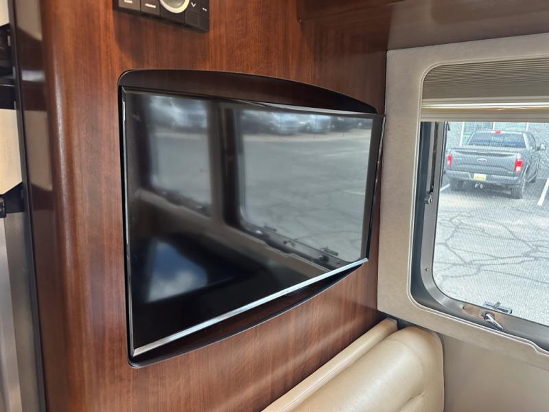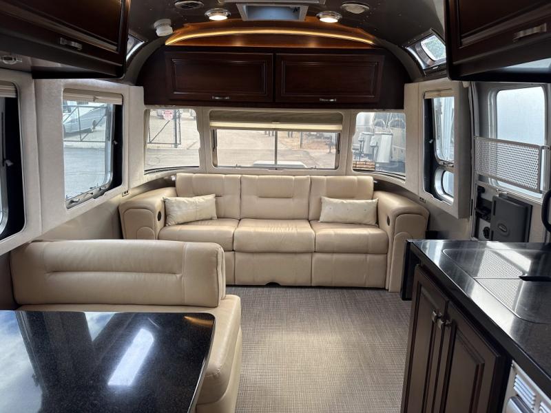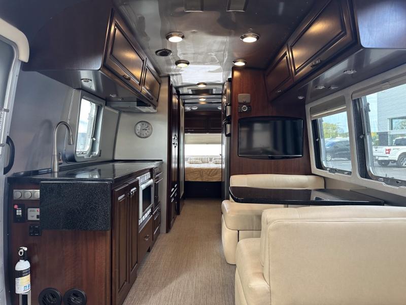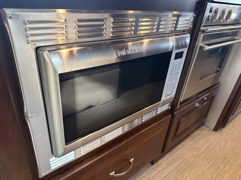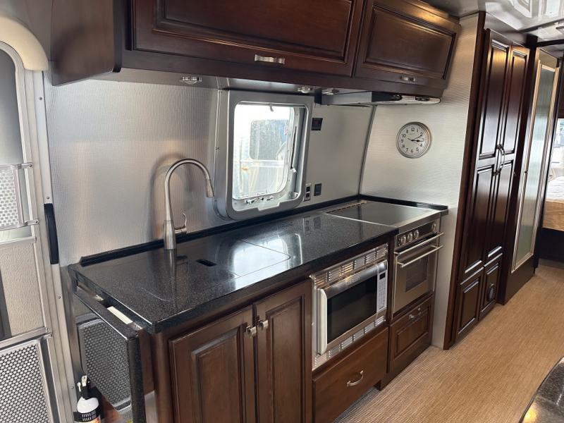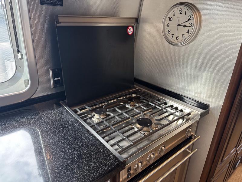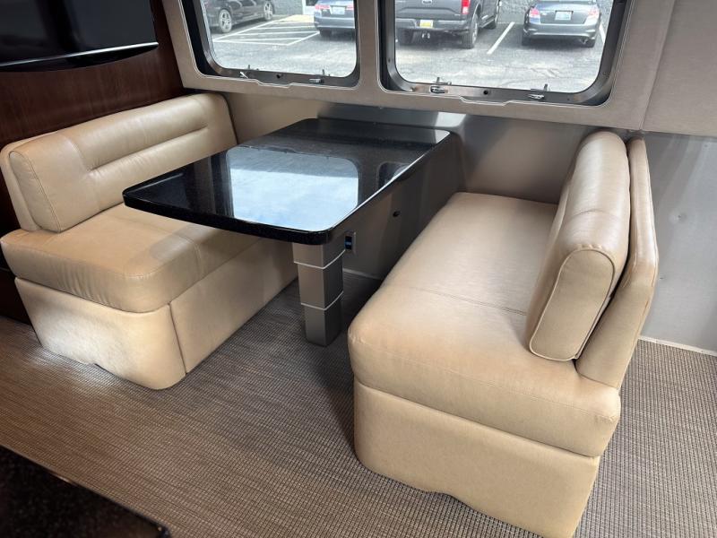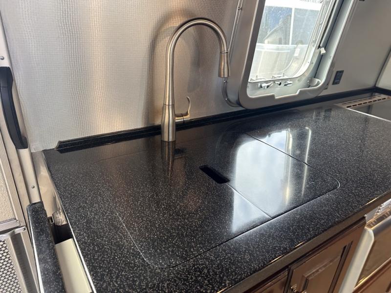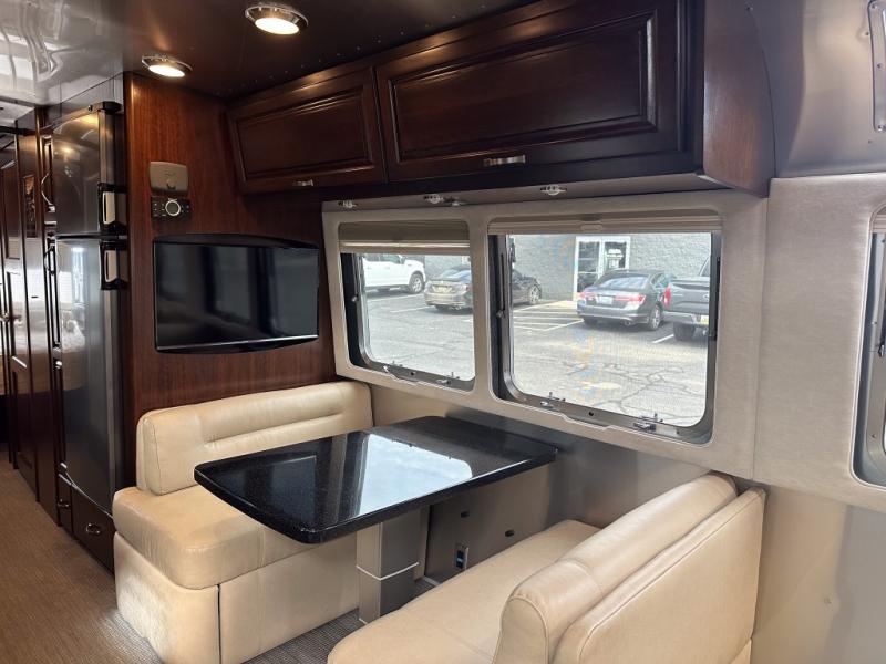 The galley has a double kitchen sink, three burner range. On the opposite side of the trailer you will find a dinette, LED TV above the dinette, refrigerator and slide out pantry.