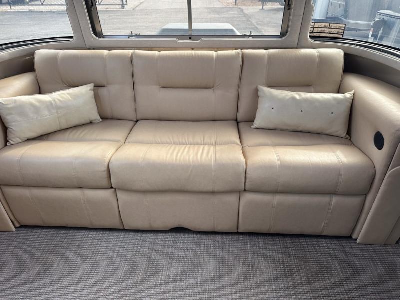 As you enter the travel trailer, along the front wall of the trailer there is a sofa with power recliners.