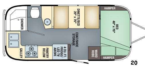The Flying Cloud 20 travel trailer by Airstream offers a rear corner kitchen area.