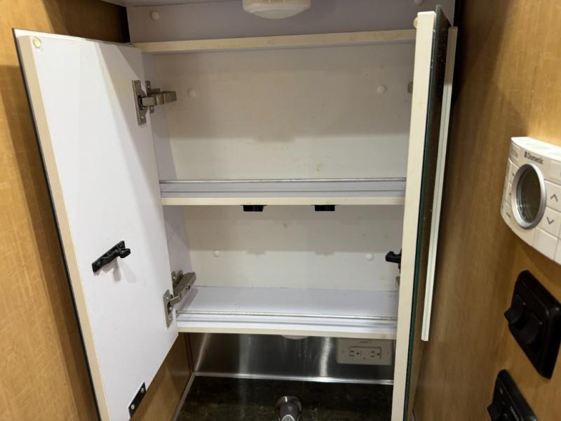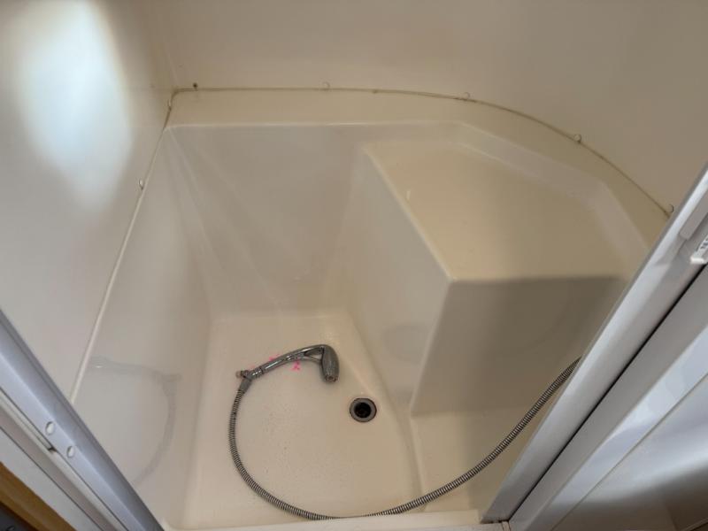 The rear corner bathroom has a shower and toilet. Just outside of the bathroom area there is a sink with a wardrobe between the sink and the refrigerator, plus more.