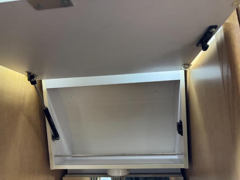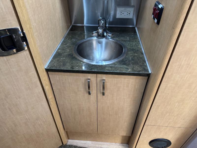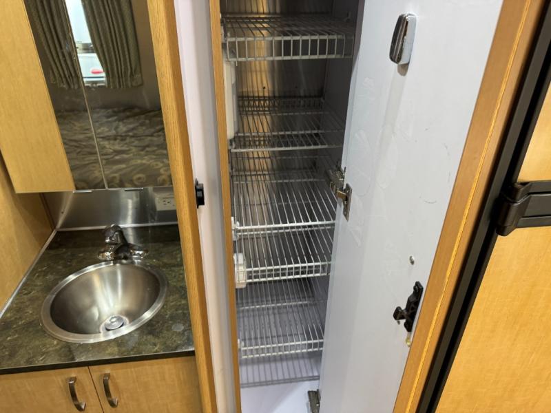 The galley has a sink, three burner range, and pantry on one side of the trailer. On the other side there is a refrigerator and a microwave above.